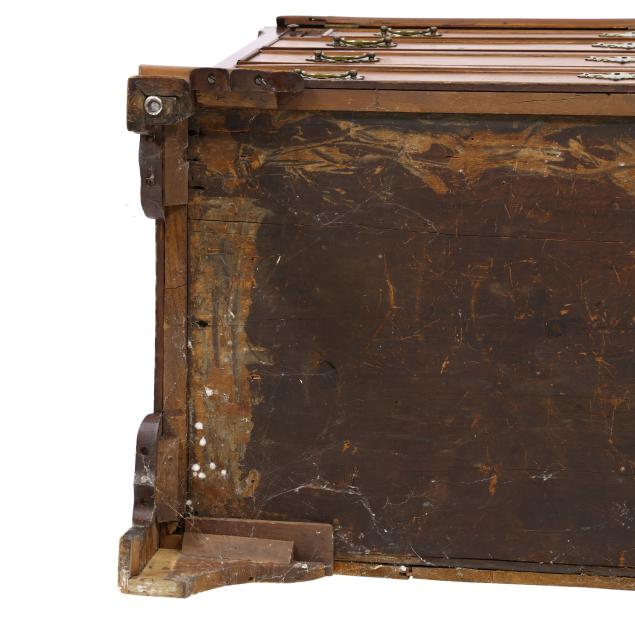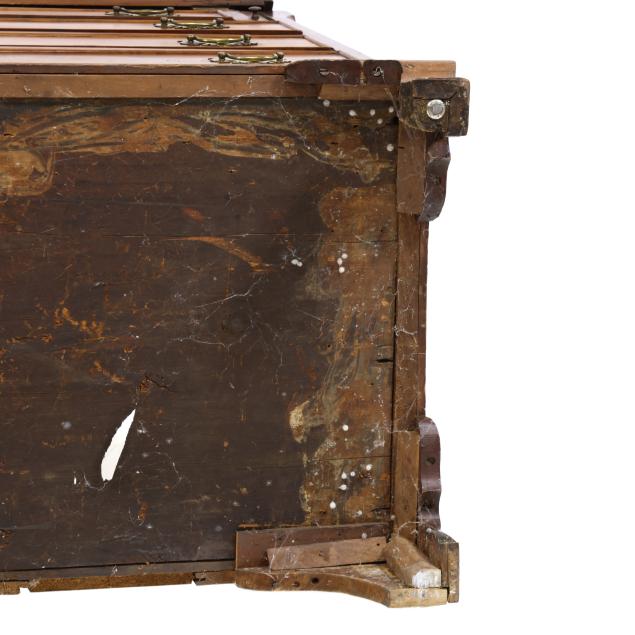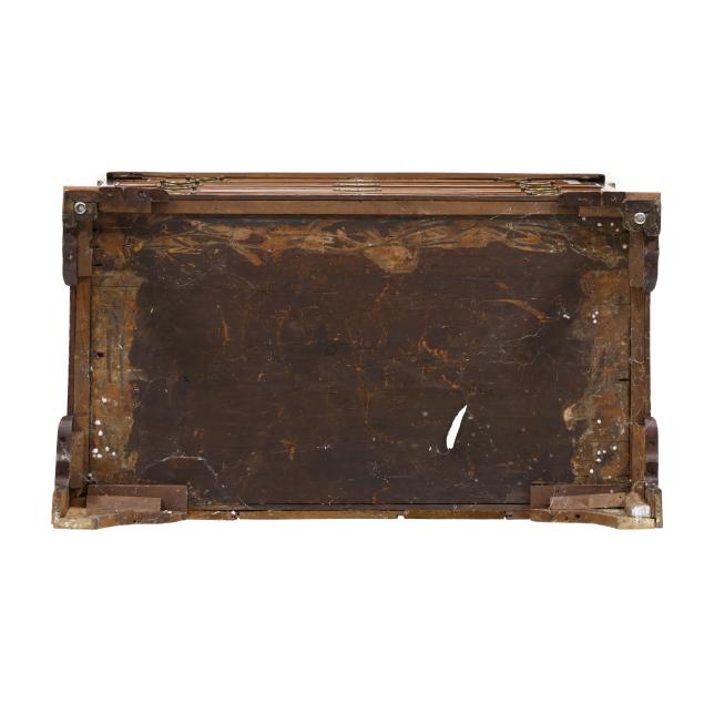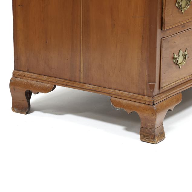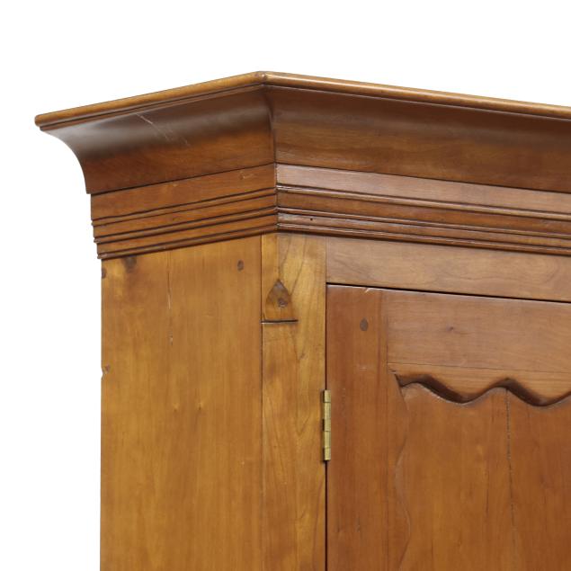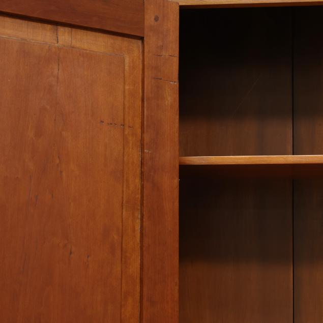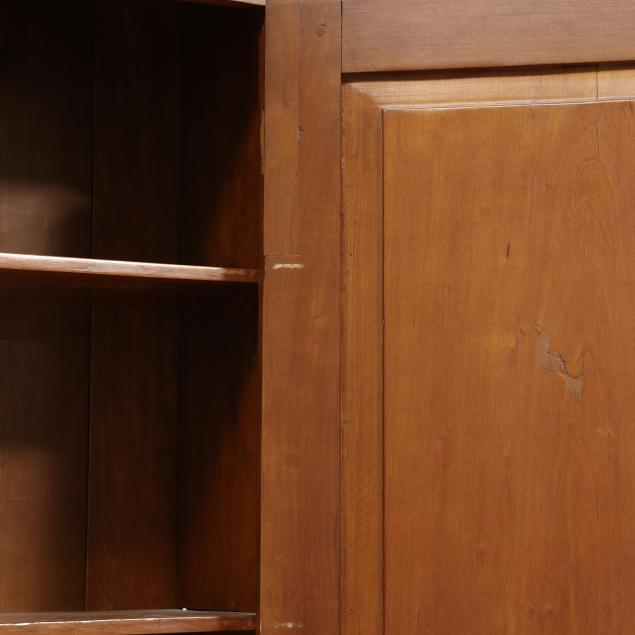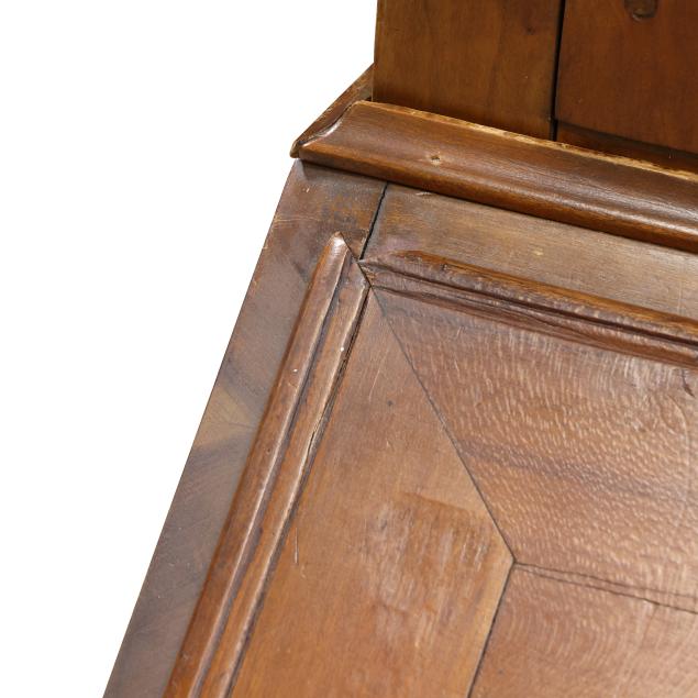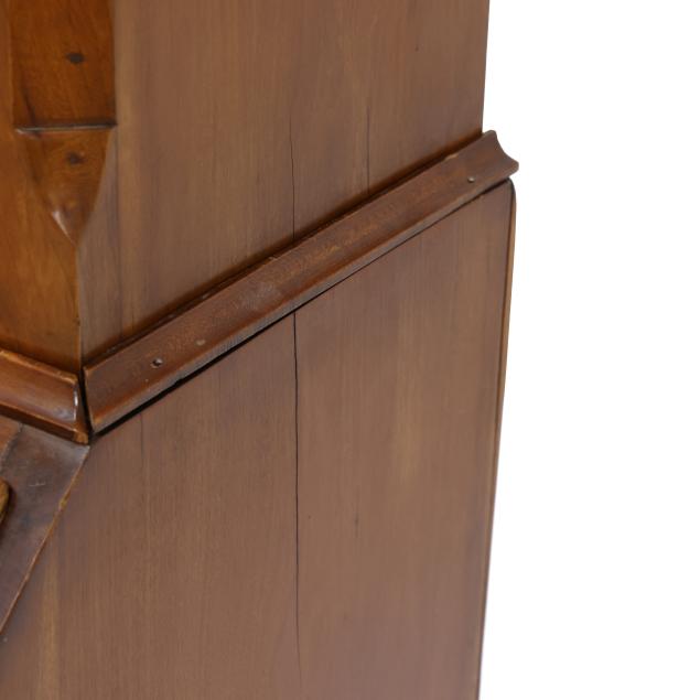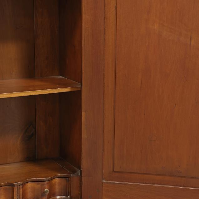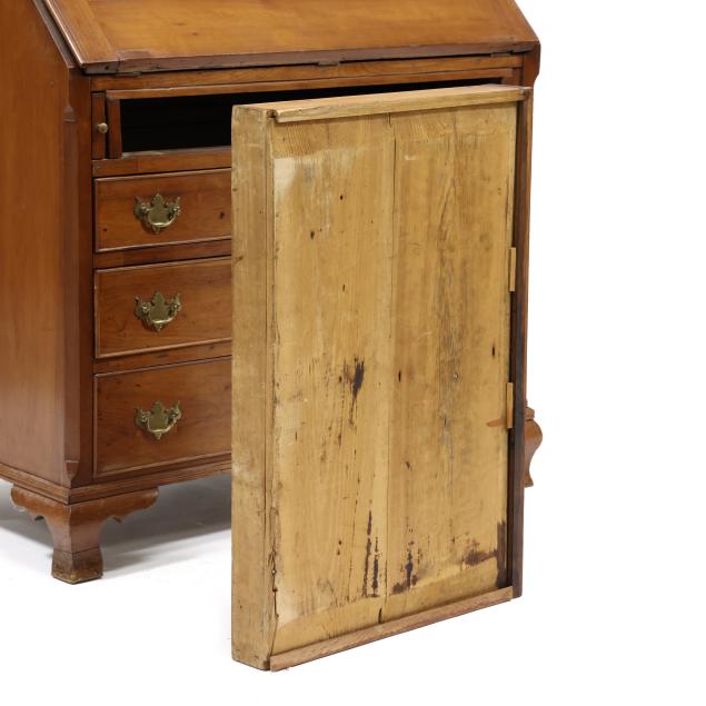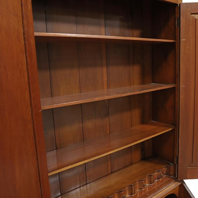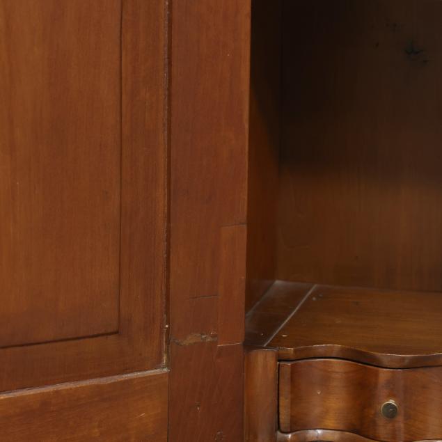 From a Private Collection, Frankfort, Kentucky Top cornice flat trim is later; right door with cut and patches near hinge areas; left door with interior cut/patch near hinge areas; the desk with small cut and patch to the exterior near hinge area; later hinges; interior marring and wear to writing surface; later pulls and brasses; missing locks; later drawer guides; old likely later feet reset and with later bracing; upper and lower back boards reset; upper left horizontal strip later.