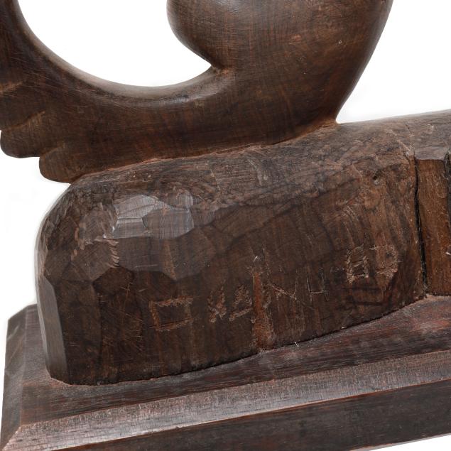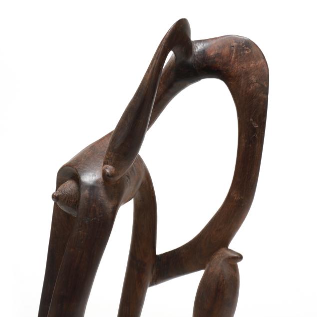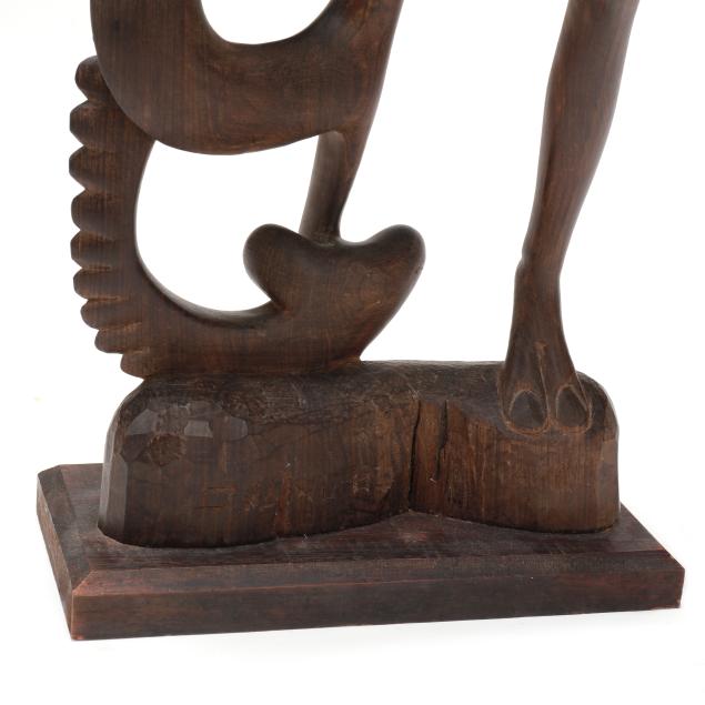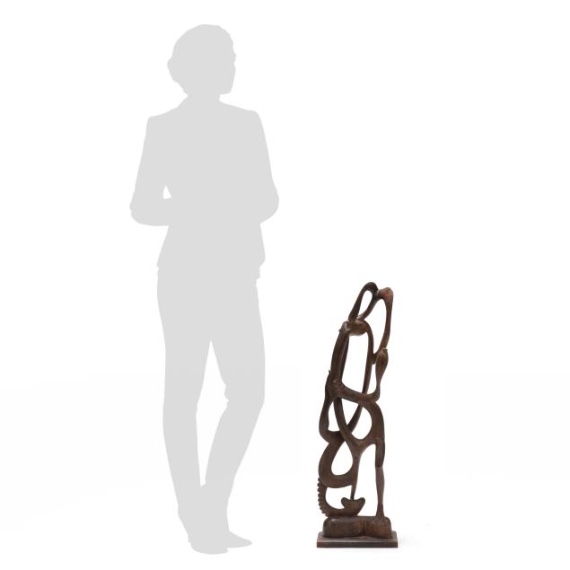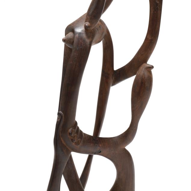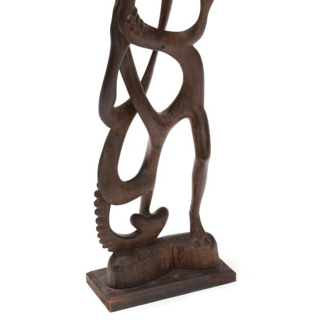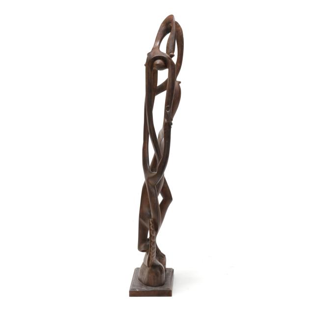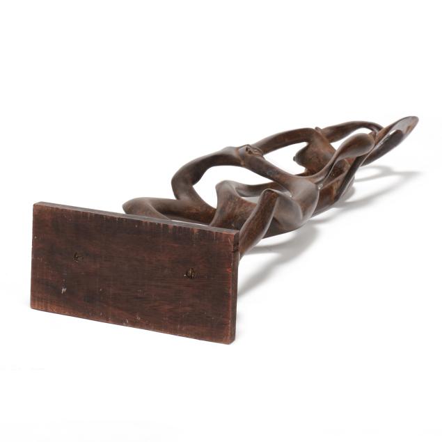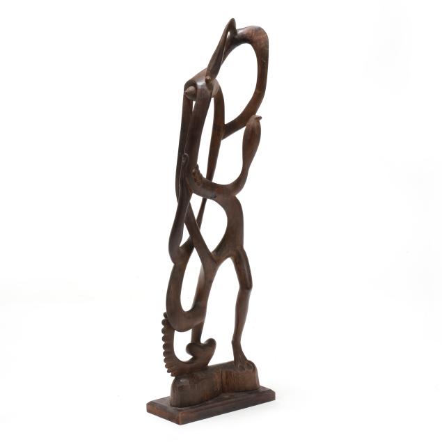 Tanzania or Mozambique, Africa, second half 20th century, carved African blackwood (mpingo) to depict a Shetani (Swahili for "evil spirit"), signed "CHANUO?", possibly by Chanuo Maundu (African, 1930s-1994), mounted to rectangular wood plinth.