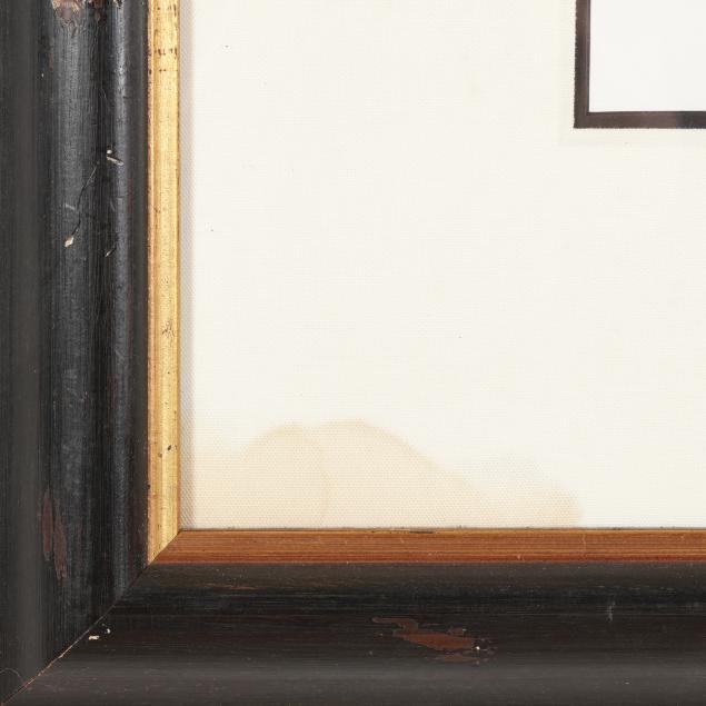 Some light wear, including several spots; wear to framing and matting (chipping to frame and stains to matting); not examined out of frame.