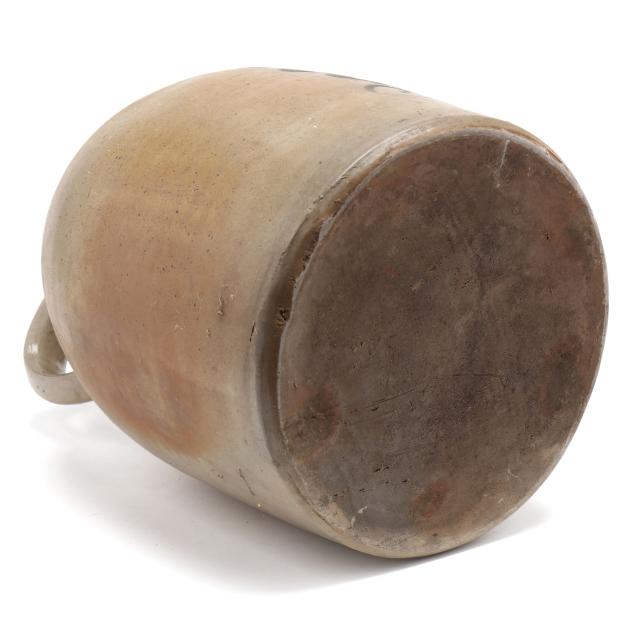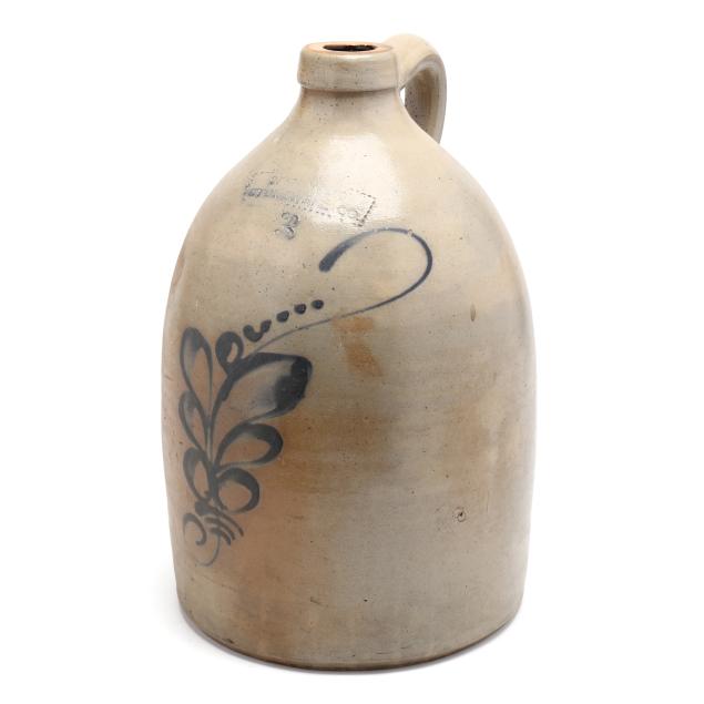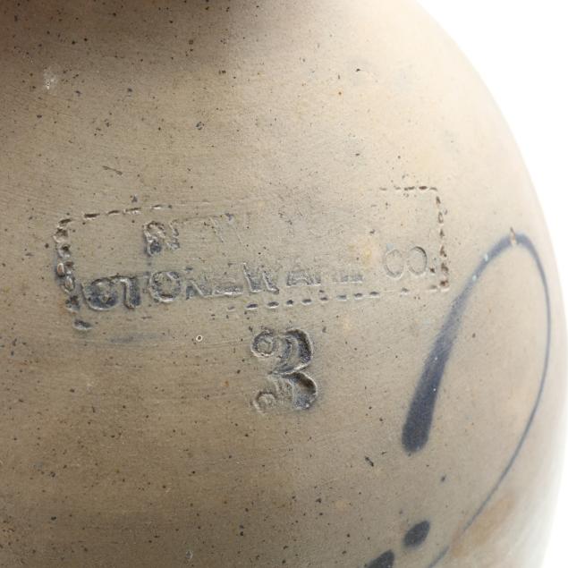 Mid- to late 19th century, salt glazed stoneware jug with cobalt foliate decoration to body, stamped "NEW YORK / STONEWARE CO" above "3" gallon capacity mark shoulder.