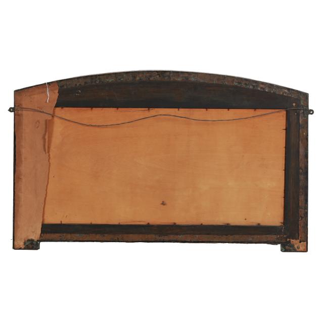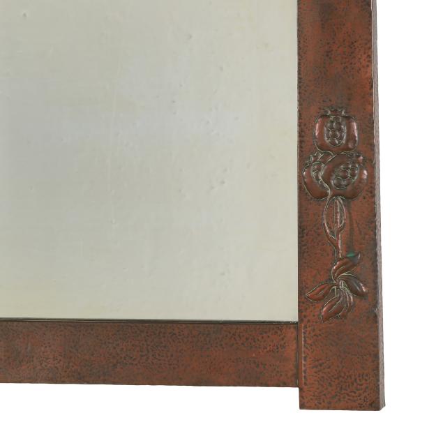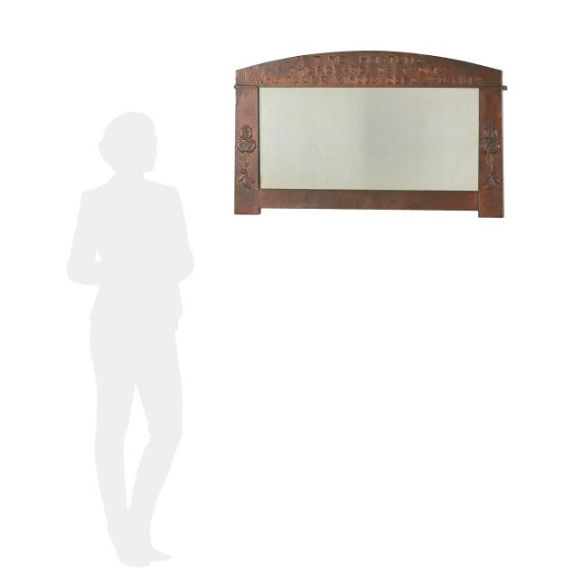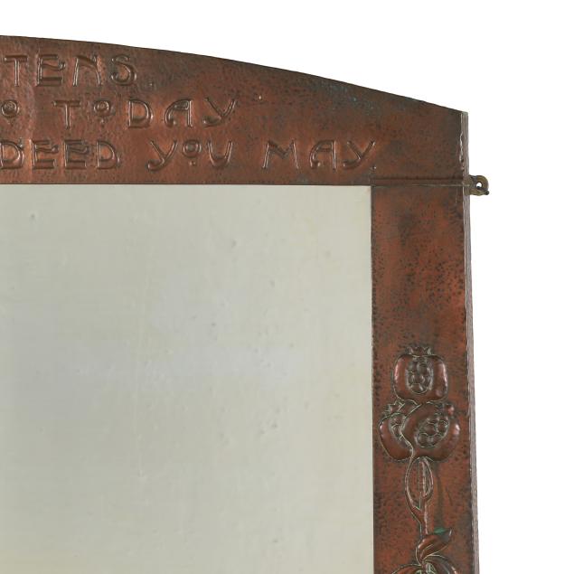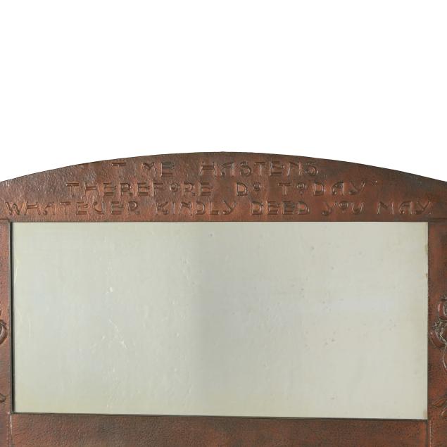 Early 20th century, hammered copper sheeting, mounted to wooden frame, horizontal mirror flanked by repoussé poppy motifs, beneath an arched pediment with repoussé adage "TIME HASTENS / THEREFORE Do ToDAY/ WHATEVER KINDLY DEED YoU MAY," unsigned.