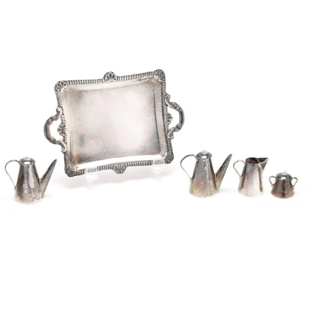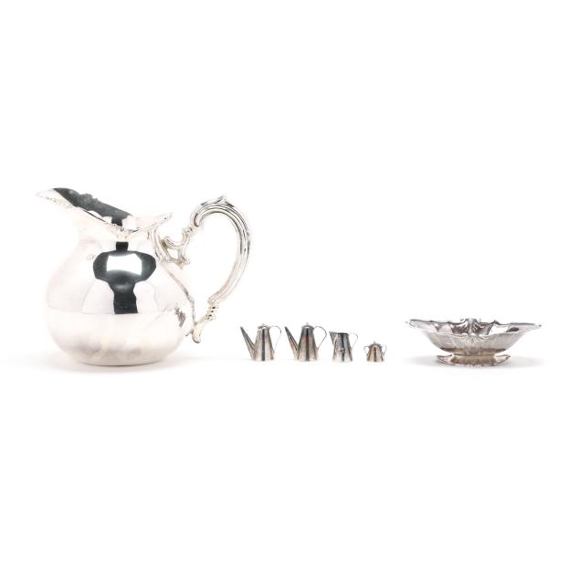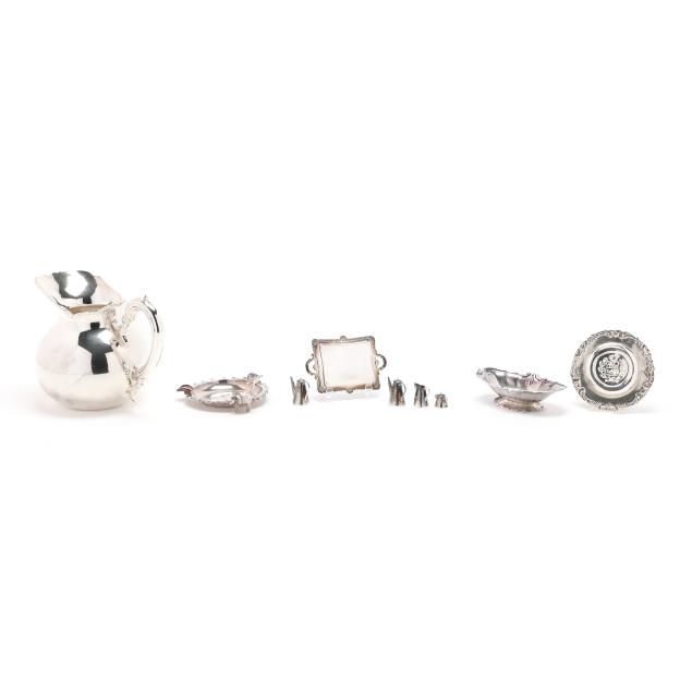 925 silver, includes a pitcher (5 1/2 in.); a footed bowl; (2) ashtrays; and a miniature tea service; by various makers, not monogrammed.