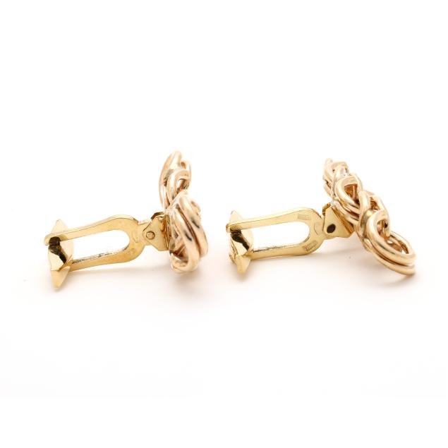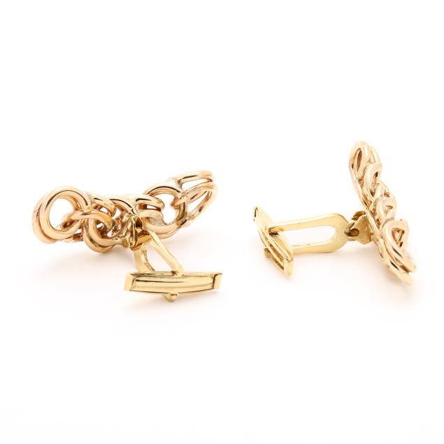 The cufflinks in double curb link motif, completed with hinged backings and whale tail backs, cufflinks testing 14KT, backing stamped 750 / E.R. and with Italian registry mark 389 VI.