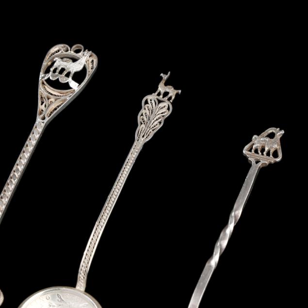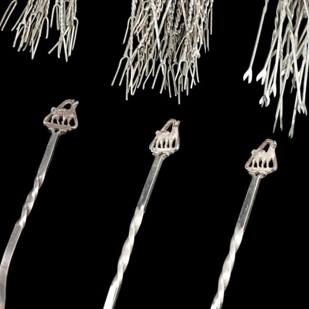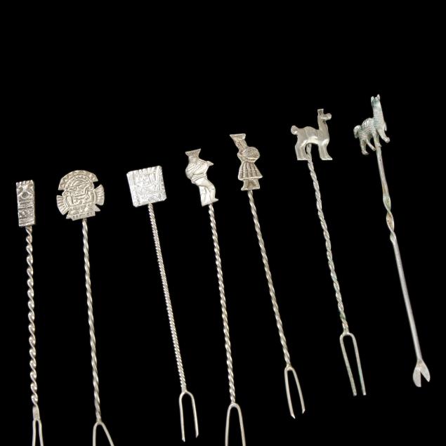 (199) pieces to included: a large pair of sterling salad servers with wooden handles; (120) cocktail pick, many marked "925", with various figural motifs; a set of (6) filigree teaspoons, not marked' (36) spoons and ladles marked "925" with Peruvian motifs to the handles; (9) ladles with coin bowls; and a set of (6) foliate sterling teaspoons; and (2) cased sets of (6) sterling silver demitasse spoons; This lot also includes (8) pieces of Mexican sterling silver flatware. Not monogrammed.