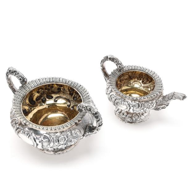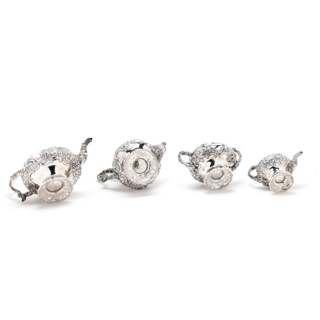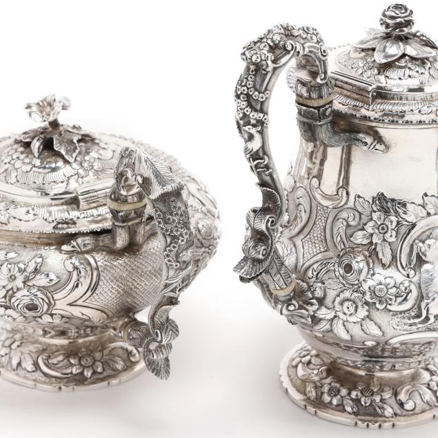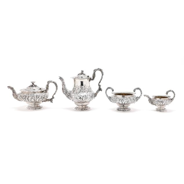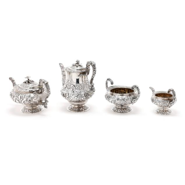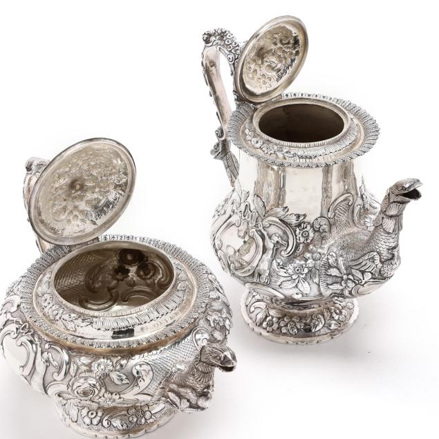 London (1825), includes a coffee pot (9 in.); teapot (6 1/2 in.); creamer; and sugar bowl; each ornately decorated with foliate and figural repousse including hunt motifs of hares, deer, and pheasants in a forest landscape; with palmette leaf rims, gold wash interiors, and figural spouts; not monogrammed.