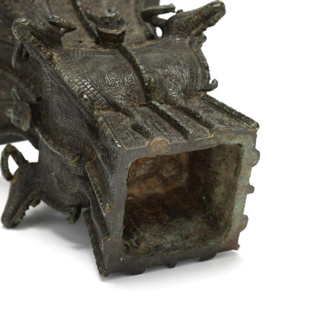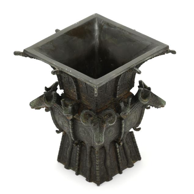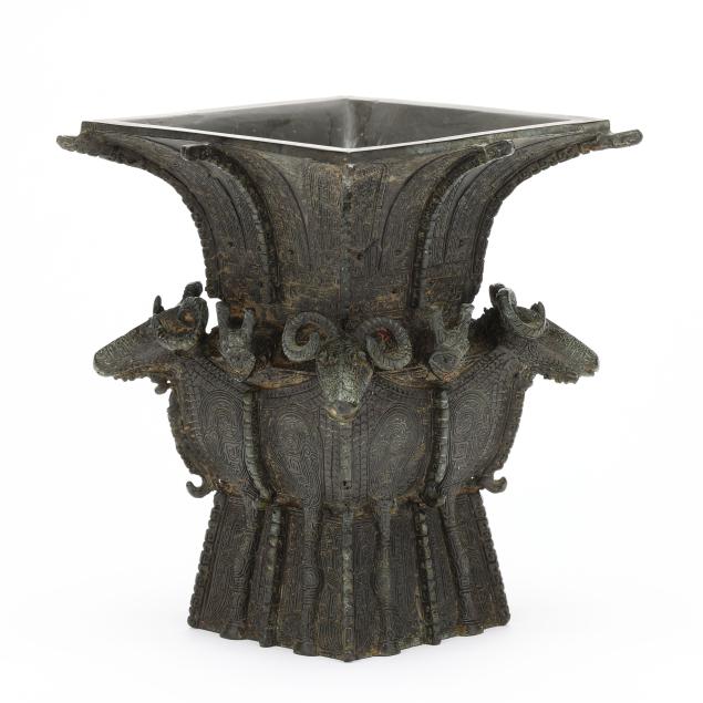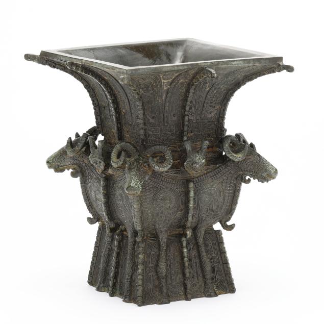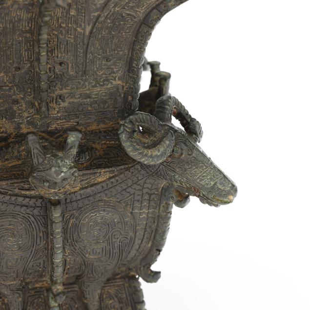 taotie designs in low relief to the body, with four ram heads cast in high relief along the shoulders, modeled after a famous vase in the National Museum of China collection.