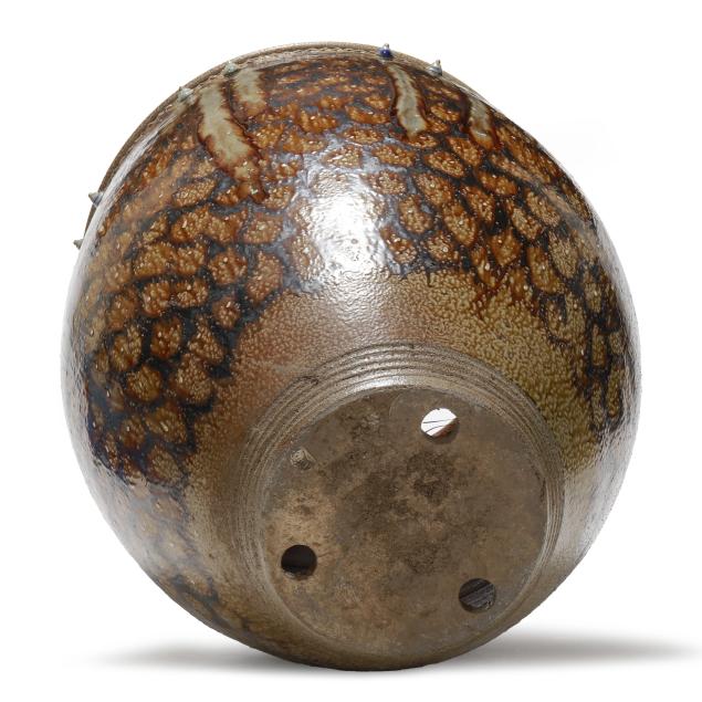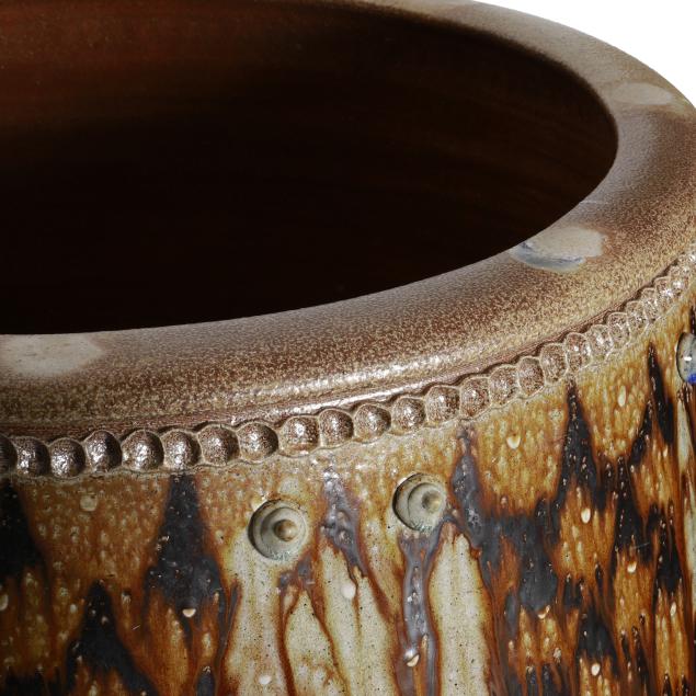 Salt glazed stoneware, rim signed with circa 1995-present "WMH" oval cipher and stamped "73" firing number, rotund cylindrical body with semi-round flat rim, decorated in ash and manganese glazed scaled patterns, tooled fluted band designs and conical bosses with glass runs, base with three drainage holes.