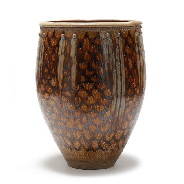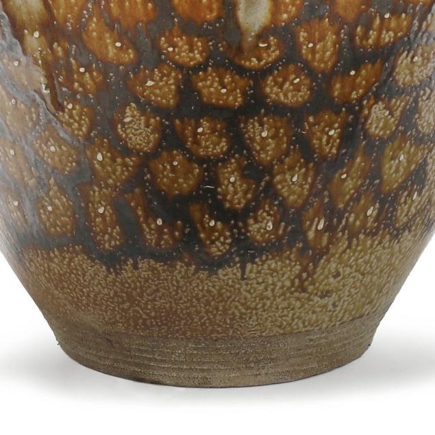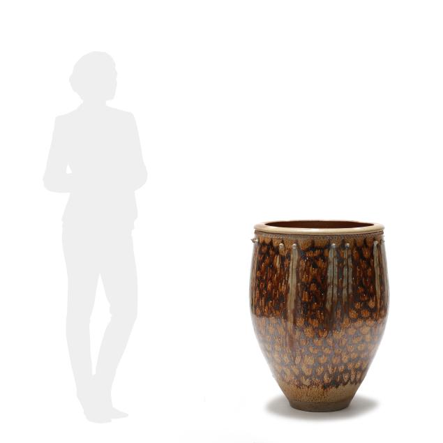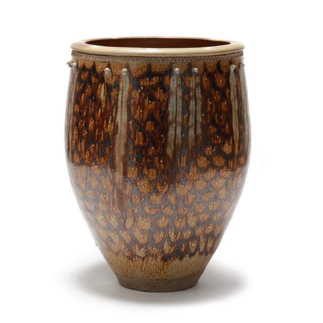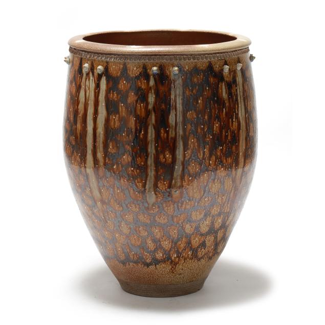 In 1983 they moved to Pittsboro NC and set up their pottery. Mark built a very large wood kiln and began making the distinctive functional pots for which he is known, specializing in very large planters and jars, along with finely made smaller items. He uses local clays and blends the different North Carolinian folk traditions together into a contemporary style that has attracted a sizeable following.