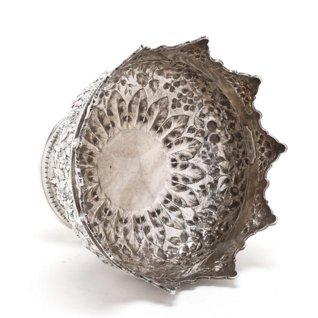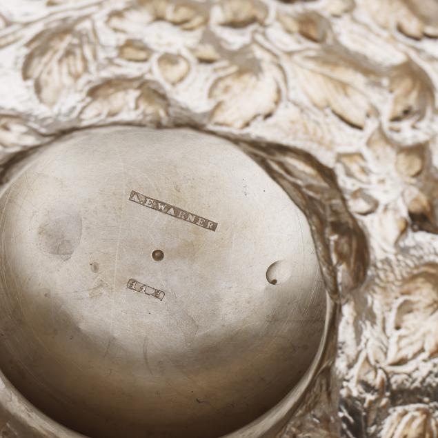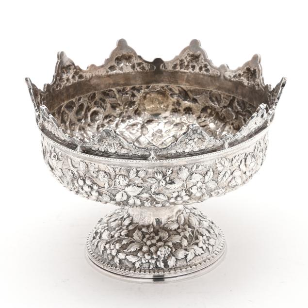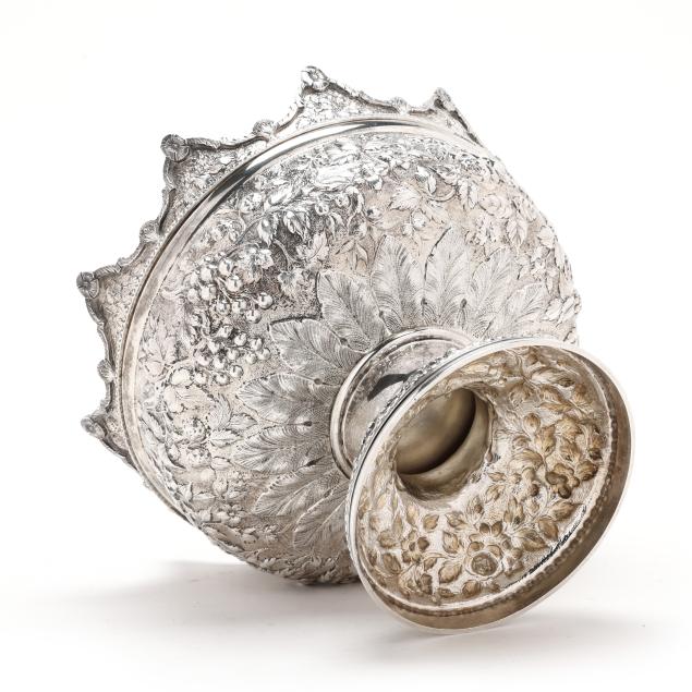 Circa 1860s, a two part form with pedestal bowl and removable collar, the bowl with "A.E.Warner" rectangular punch and marked "11.2" indicating the fineness. The bowl with repousse design featuring birds flying amidst fruit and flower laden branches, the crenelated collar repeats the fruit and flower motif, not monogrammed.