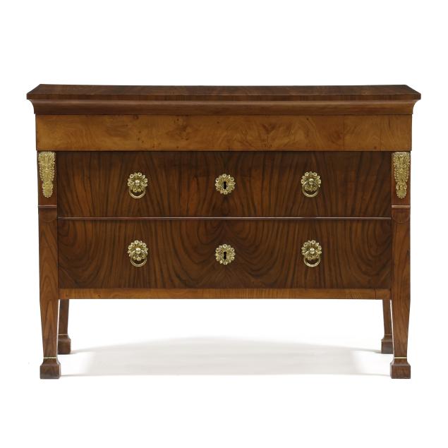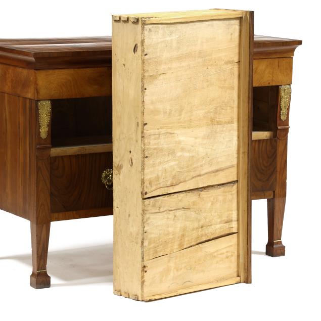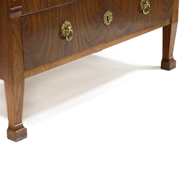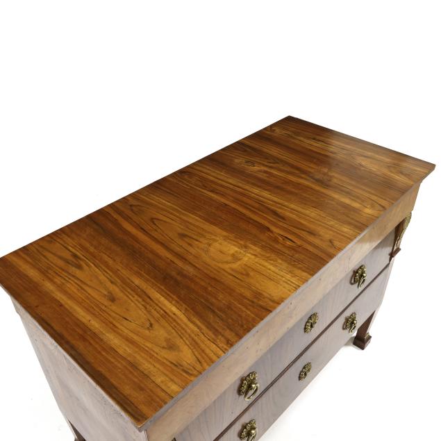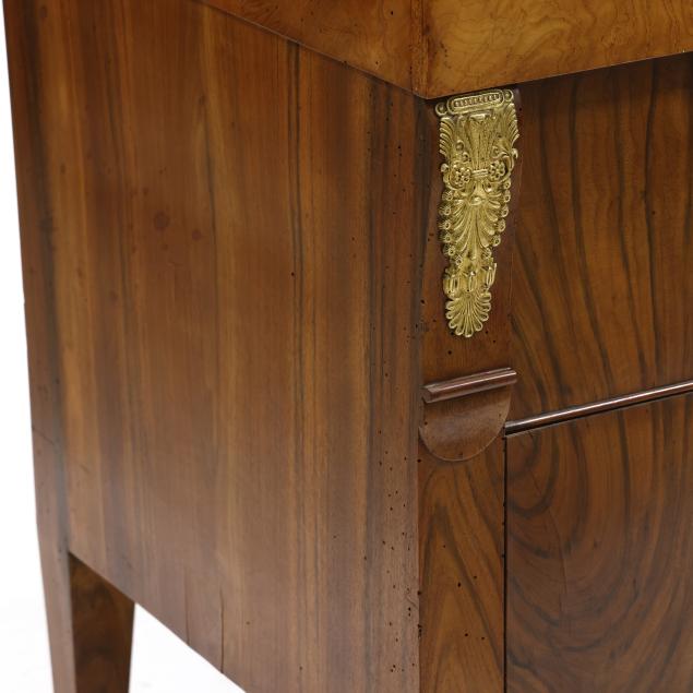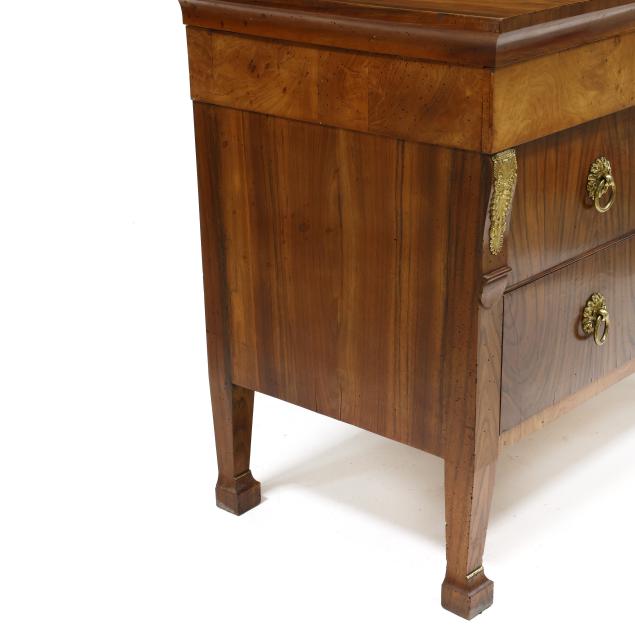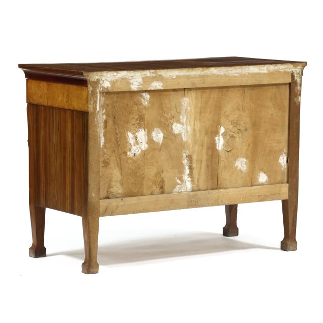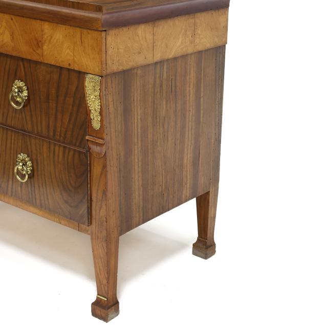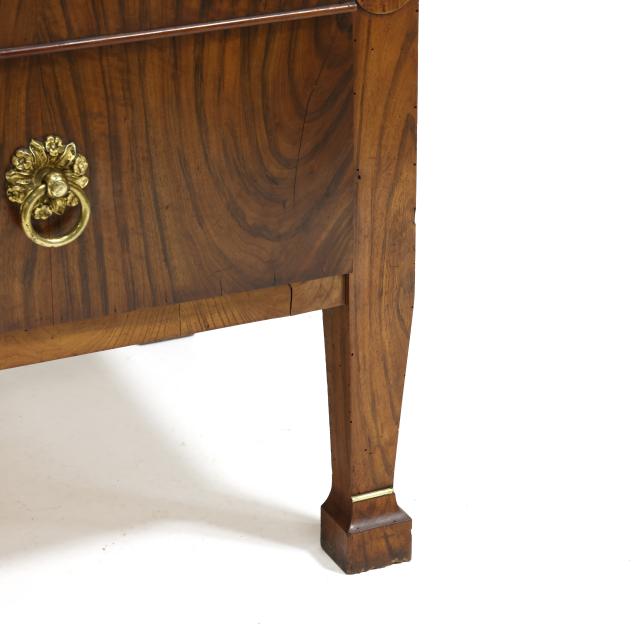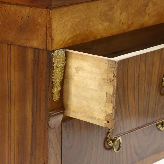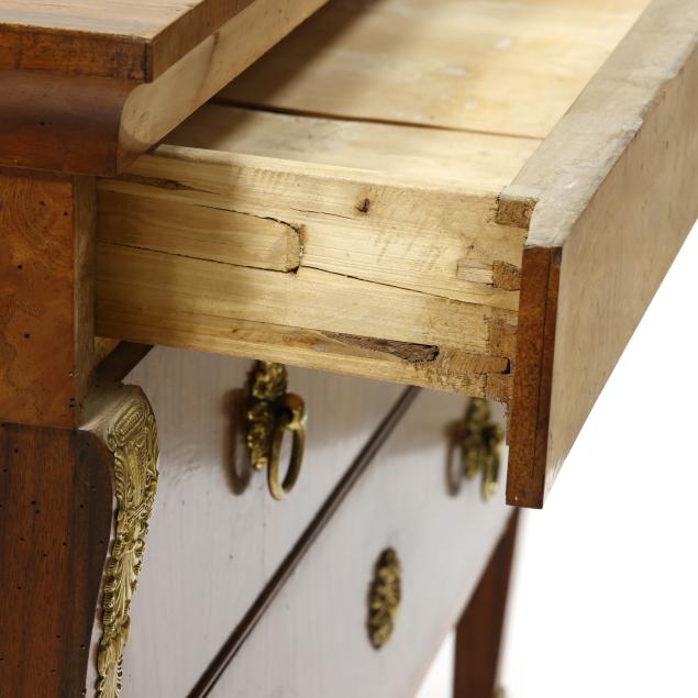 Likely Italian, mid-19th-century, rosewood and burl wood veneer, fruit wood secondary, rectangular top with vertically veneered edge, upper flush drawer over two flush drawers with book-matched veneers, scrolled capitals to the stiles with ormolu mounts, flush sides, tapered legs with Marlborough feet.