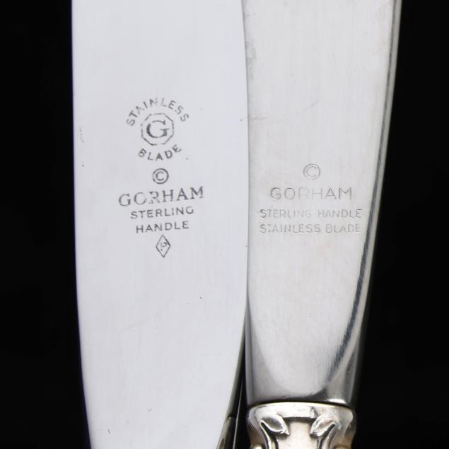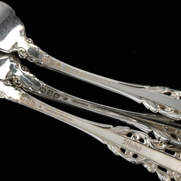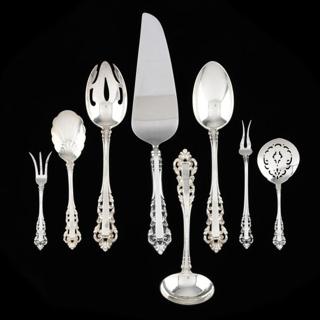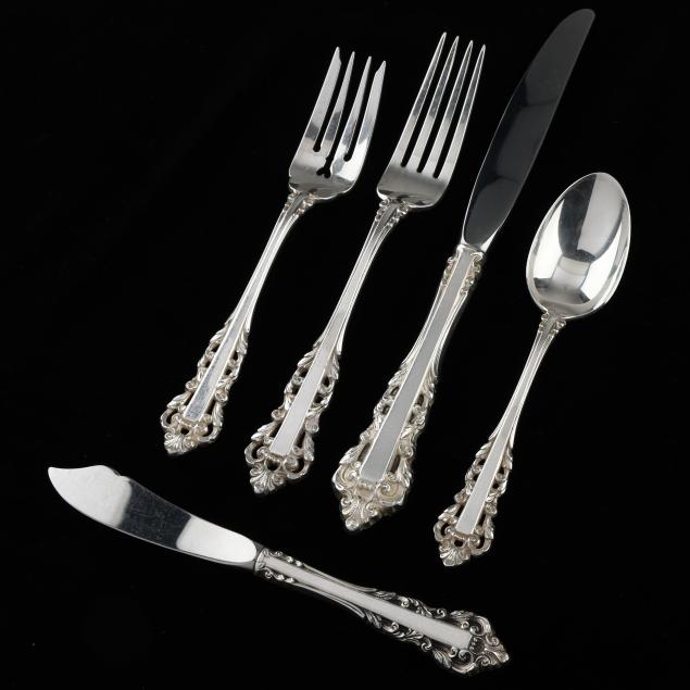 (56) pieces to include: (9) dinner knives (9 1/8 in.); (11) dinner forks (7 1/2 in.); (8) salad forks (6 3/4 in.); (17) teaspoons (6 in.); a tablespoon; a pierced tablespoon; a gravy ladle; (2) sugar spoons; a gravy ladle; a bon bon spoon; a lemon fork; a pickle fork; a master butter knife; and a pie server; not monogrammed, presented in a fitted flatware case.