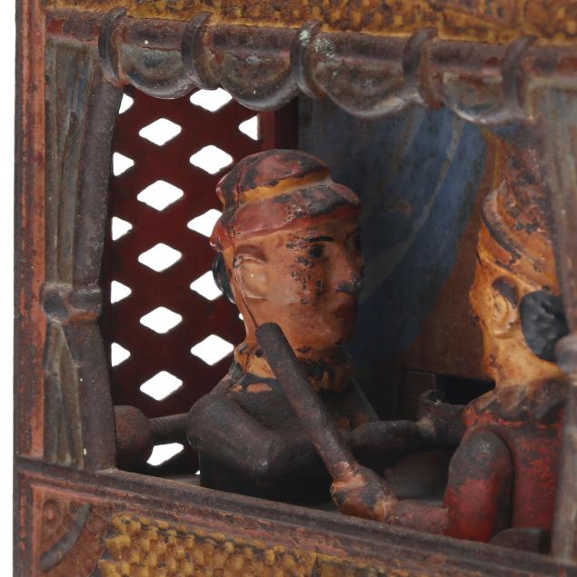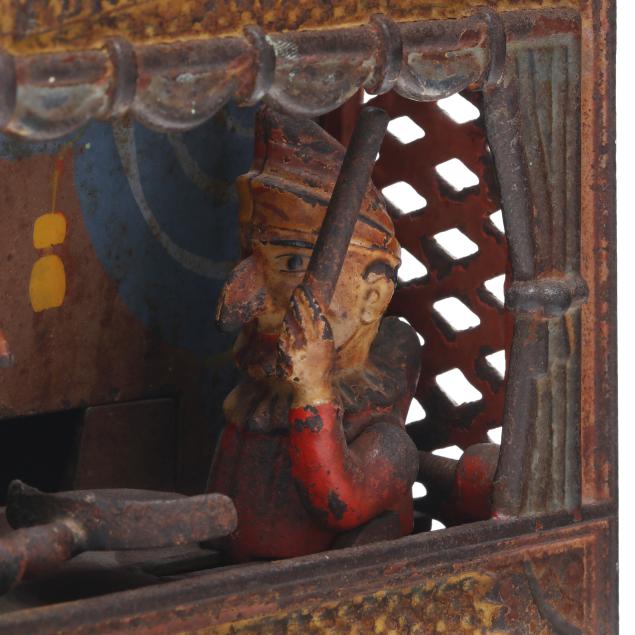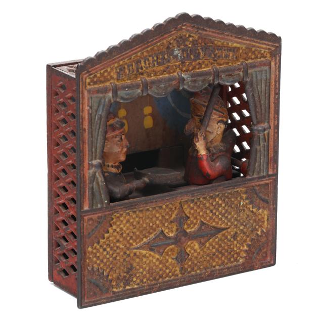 Buffalo, NY, designed by Peter Adams and Charles Shepard, patented 1884, painted cast iron, this version with small size letters to top, to use bank: pull the knob on the right side to bring Judy's plate forward, place coin on the plate, press the lever below the knob to send Punch lurching forward brandishing a club as Judy deposits the coin into the bank, stamped "BUFFALO, N.Y. U.S.A / PATd in U.S. JULY 15. '84 / AND JULY 22. '84 / RE- ENGLAND / No. 104-3" to underside.