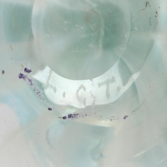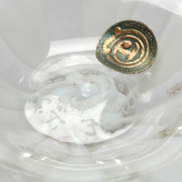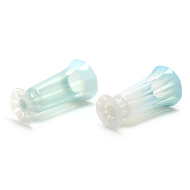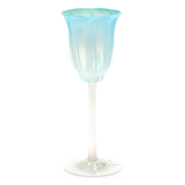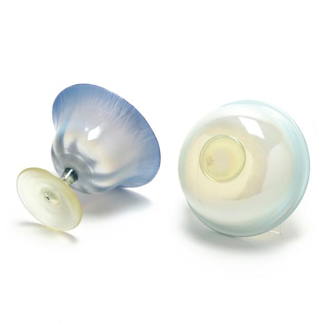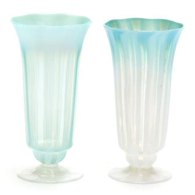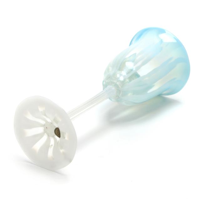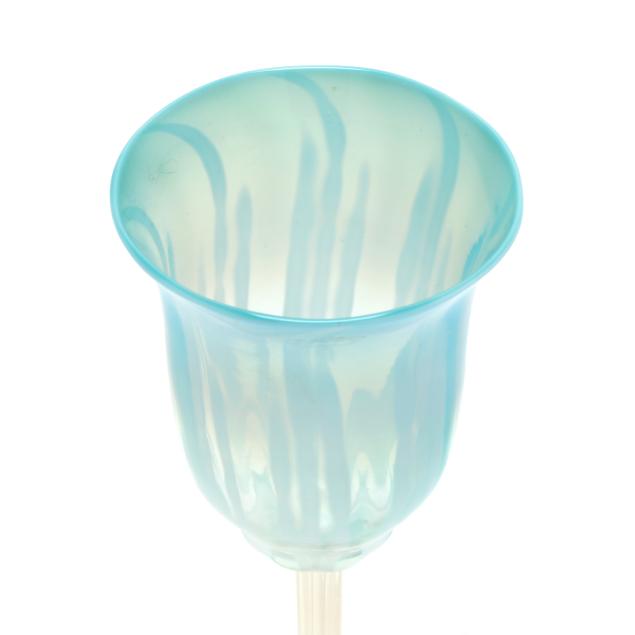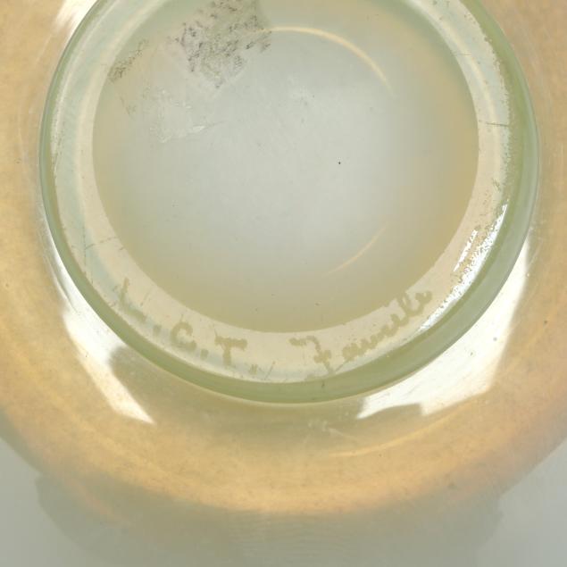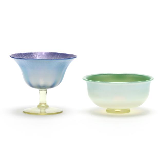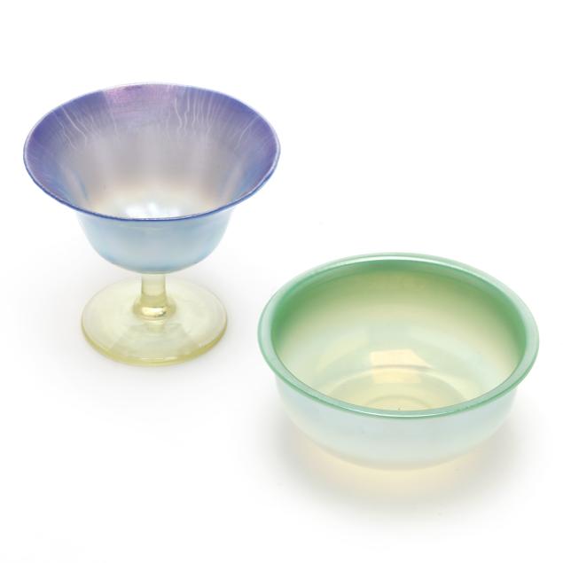 New York, circa 1910, including a pair of green opalescent and clear footed vases (6.5 in.); a tall stemmed goblet in green opalescent and clear (8 in.); a violet favrile footed bowl (3.75 x 4.5 in. diameter); and a green/white favrile bowl with small applied disc foot (2.25 x 4.5 in. diameter); signed, the goblet retains an original paper label.