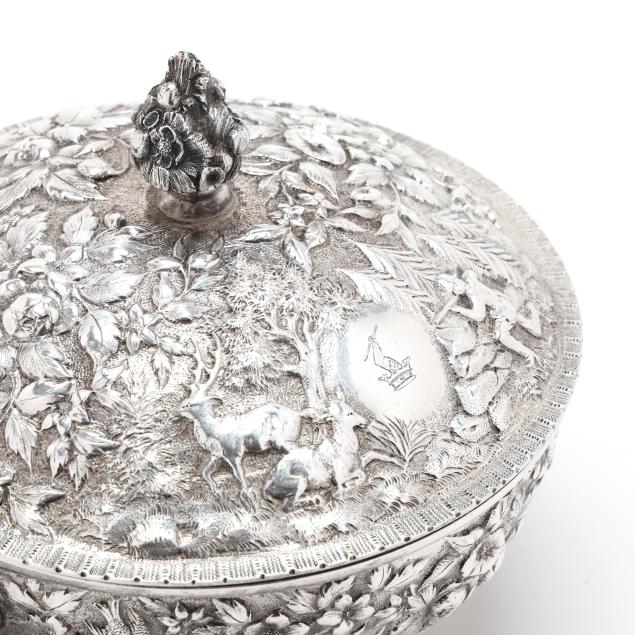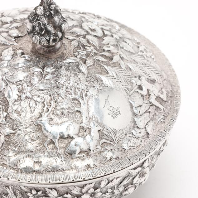 Circa 1860s, a covered pedestal bowl with "A.E.Warner" rectangular punch and "11.2" indicating the fineness. The bowl with repousse hunt themes featuring a landscape of figures and deer against a floral ground, with an armorial monogram and double lion mask ring handles.