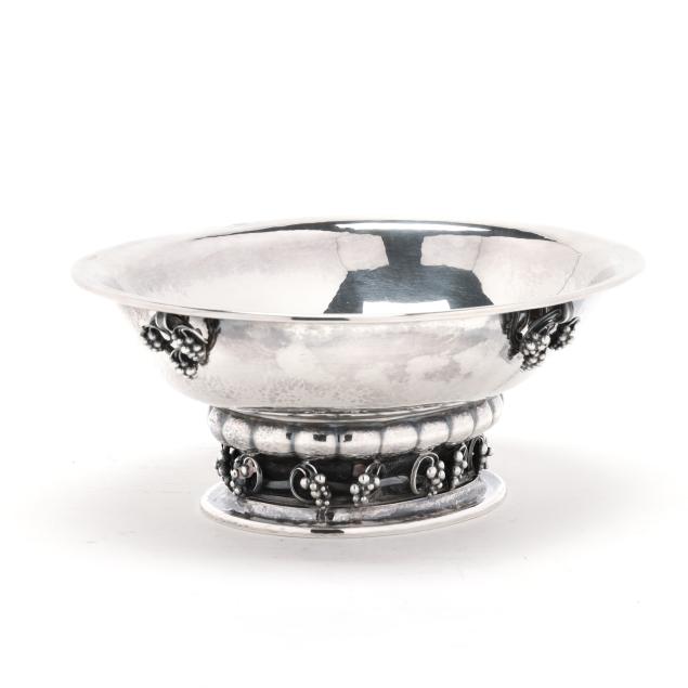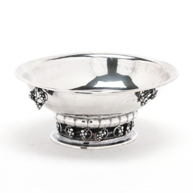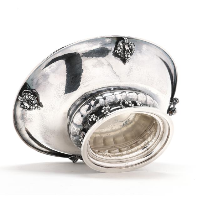 Period marks circa 1945 and after, the footed bowl with openwork pedestal and wirework vine ring handles to each side; not monogrammed.