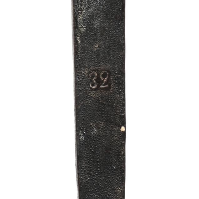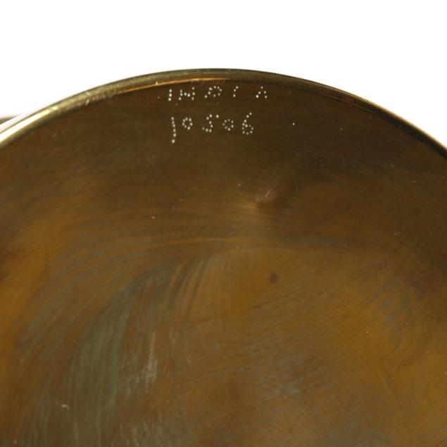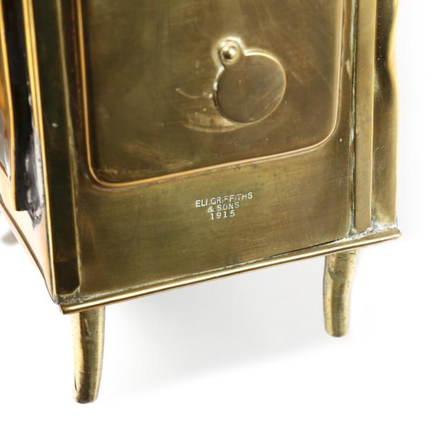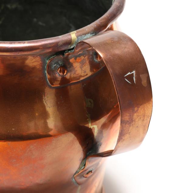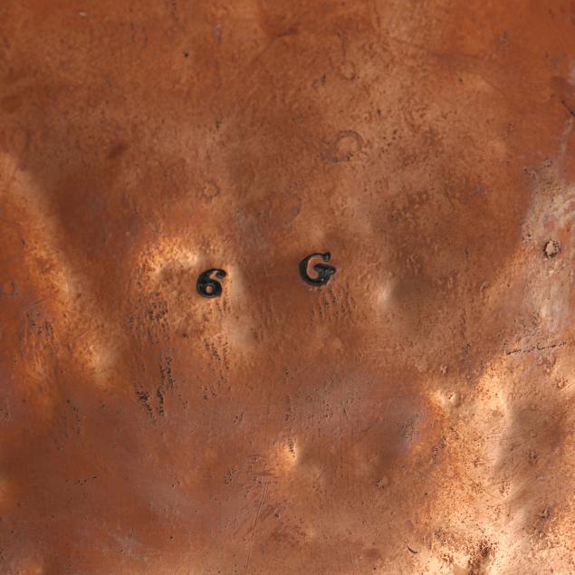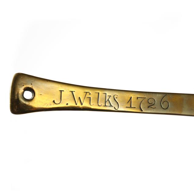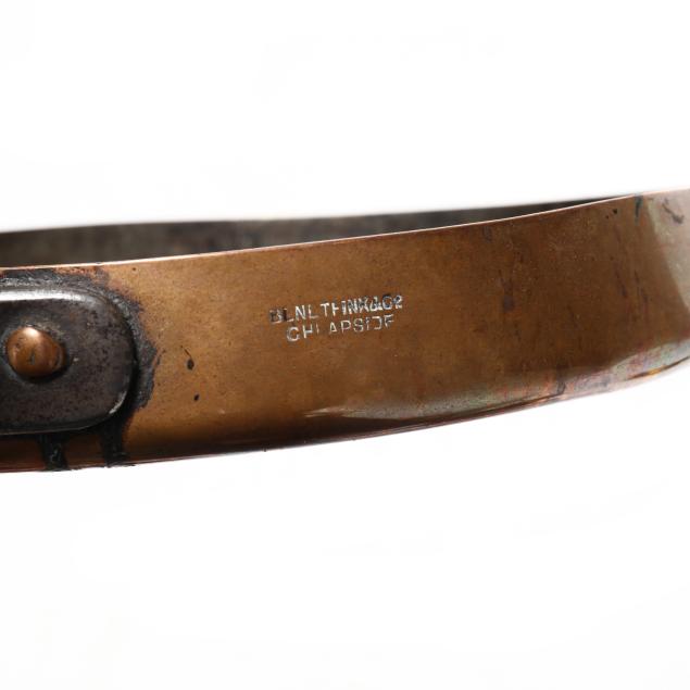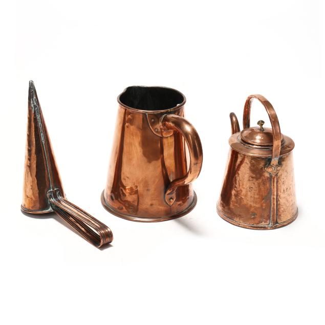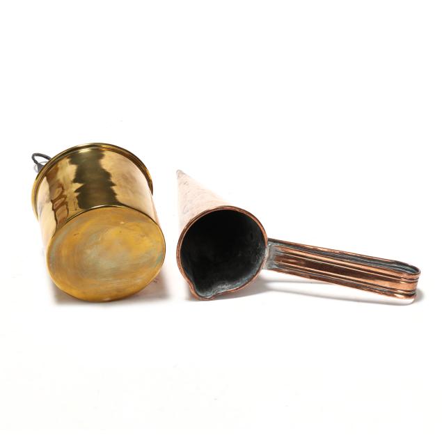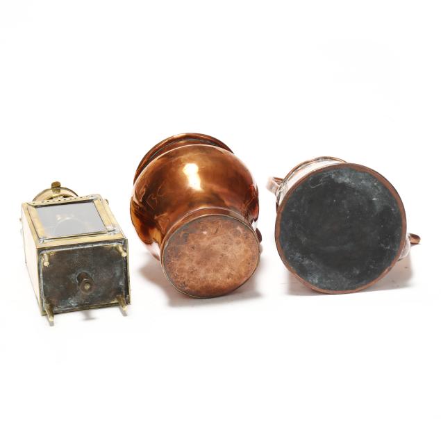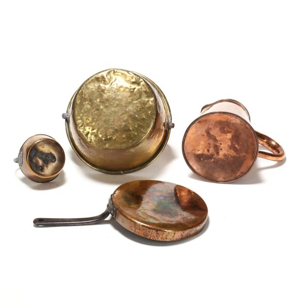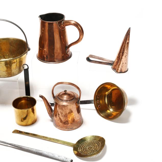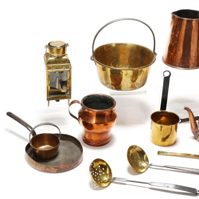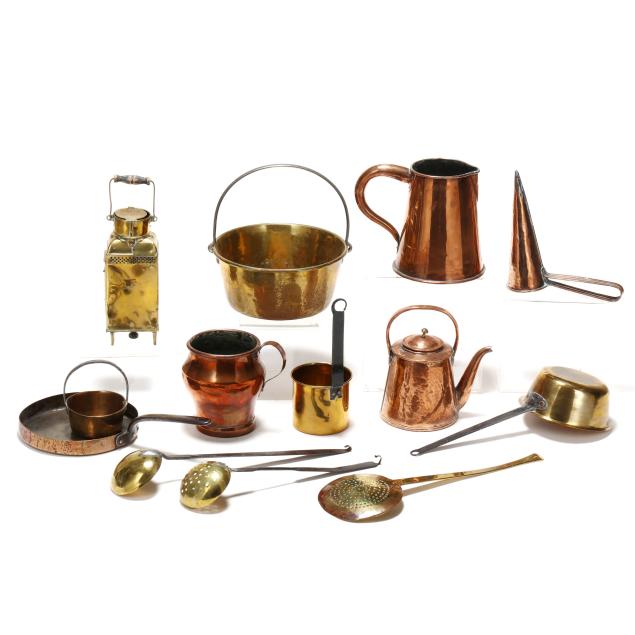 (13) pieces to include a copper teapot (11 1/2 in); a large copper pitcher stamped "6 G" to underside (10 3/4 in.); a copper water jug (9 in.); a copper ale warmer (12 1/4 in.); Benetfink & Co. (Cheapside, England) copper frying pan with iron handle, stamped to rim and underside (11 in. diameter); a small copper pot with iron handle (5 3/4 in. diameter); an Eli Griffith's & Sons brass lantern with turned wood handle, stamped with company name and "1915" towards base (13 1/4 in.); a large brass pot with iron handle (13 1/2 in. diameter); a brass saucepan with tall black painted metal handle, marked "INDIA / 10506" to underside (14 1/8 x 6 in.); a brass saucepan with long iron handle (21 3/4 x 9 1/2 in.); (2) brass ladles with iron handles, one with holes for straining (longest 23 1/4 in.); and a brass skimmer, handle signed "J. Wilks 1726" (23 in.).