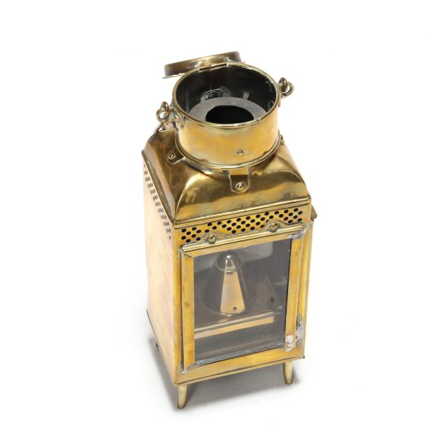 From the Estate of Dr. Charles & Shirley Herring, Kinston, North Carolina Several with verdigris and oxidation spotting; looseness to brass finial on teapot; some denting and visible soldering repair to ale warmer; denting and tarnish to Benetfink & Co. pan; lantern with visible soldering repair, wear to wooden handle, some denting to posterior; staining to underside of brass skimmer.