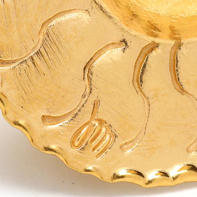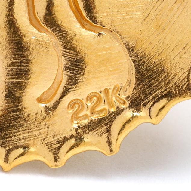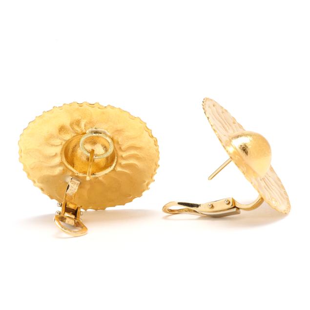 Hand-formed sun motif earrings with convex center and incised rays, completed with posts and omega clip backs, signed and stamped 22K.