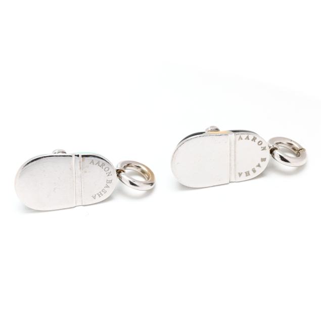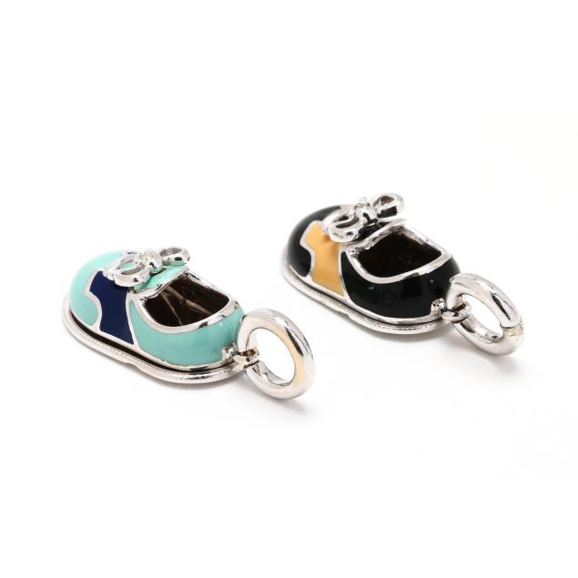To include: one with blue and teal enamel, set to the bow with a full cut round diamond (1.3mm), completed with a bail, signed and stamped 750 and with Italian registry 1248 AL (1 1/8 in.); and one with black and yellow enamel, set to the bow with a full cut round diamond (1.3mm), completed with a bail, signed and stamped 750 and with Italian registry 1248 AL (1 1/8 in.) (jump ring with solder marks).