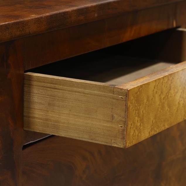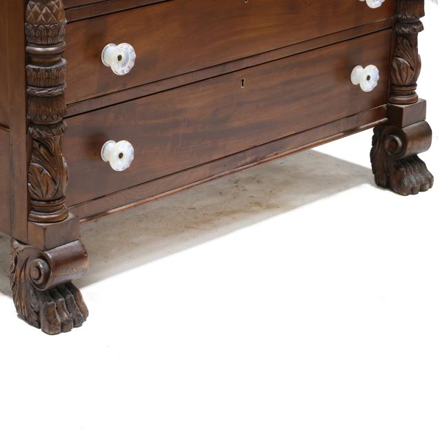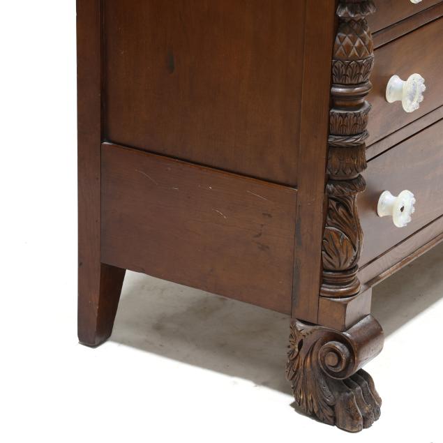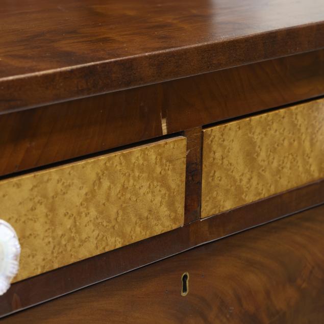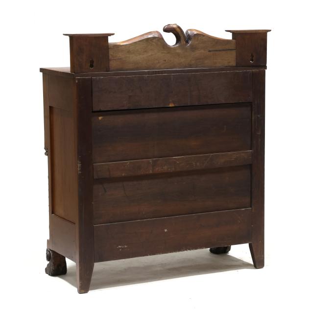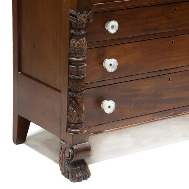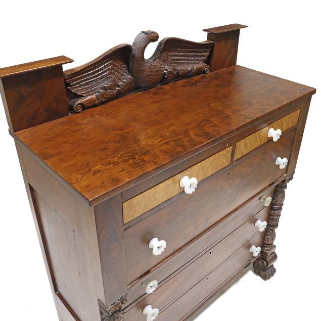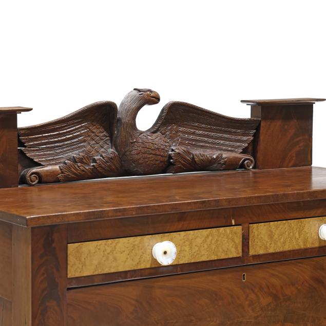 Circa 1830, mahogany veneer, birds eye maple veneer, cherry, with poplar and white pine secondary, the backsplash with later relief carved spread winged eagle (20th century), supported by original panels with plinth, two upper side by side drawers with birds eye maple above a deep projecting drawer above three recessed graduated drawers, stiles with applied carved columns featuring pineapple and acanthus leaf, paneled sides, front carved scrolled paw feet.