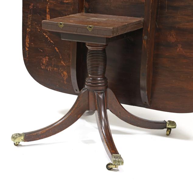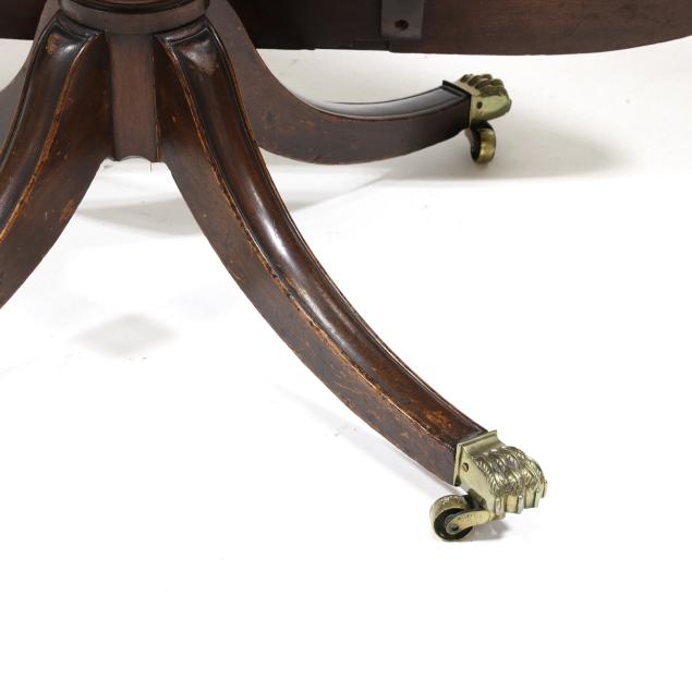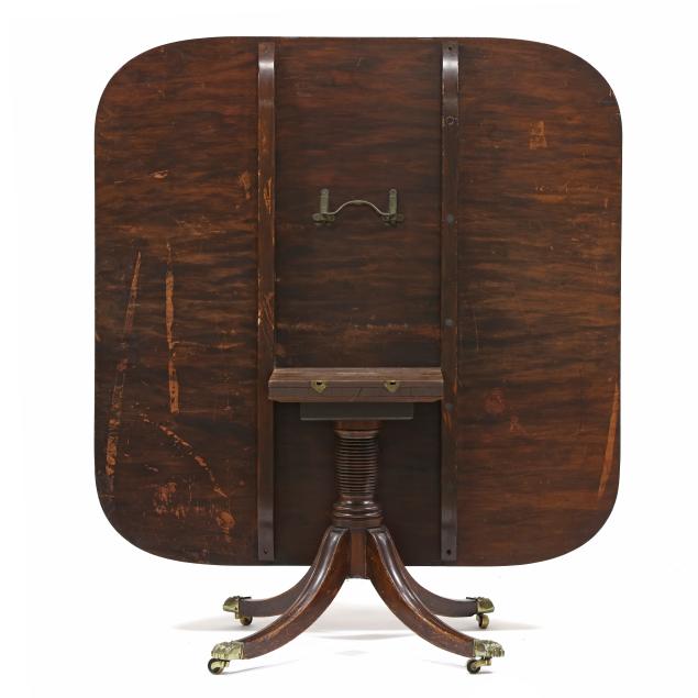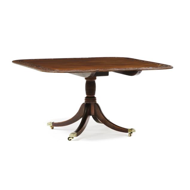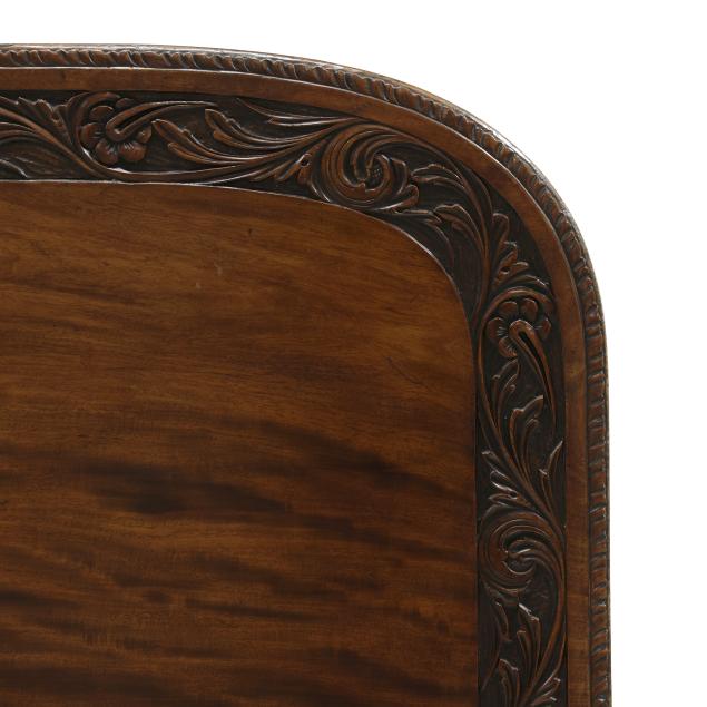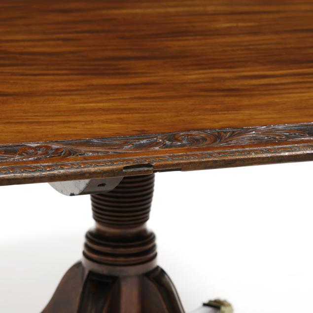 Circa 1820, solid mahogany rectangular top with acanthus and gadrooned relief carved edge, the top featuring bold graining, the standard featuring a traditional "beehive" standard, supported on quadruped base, four down-swept molded legs, brass paw feet on casters.