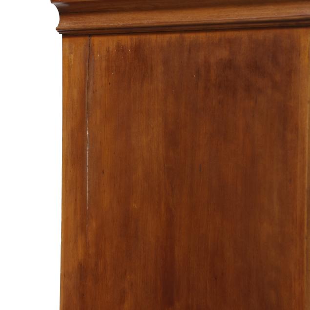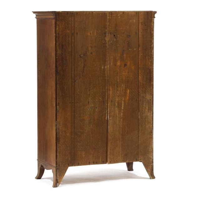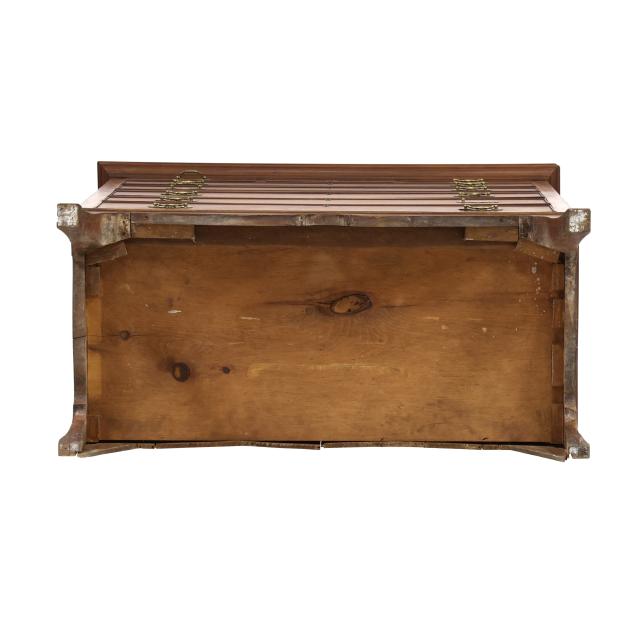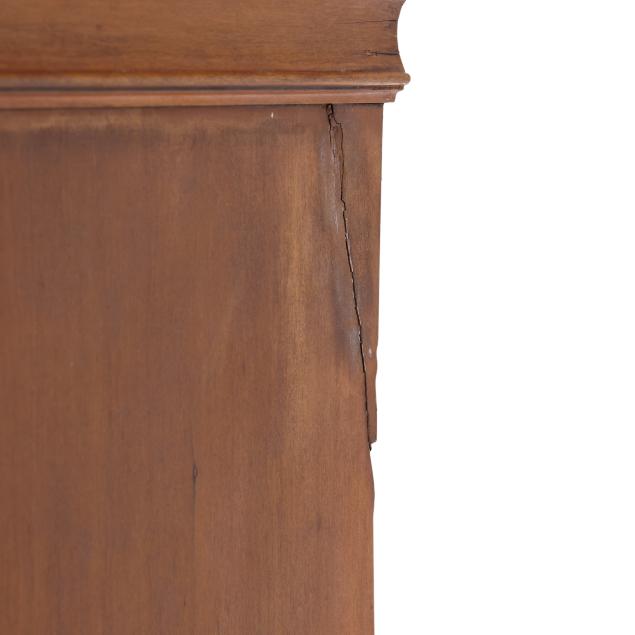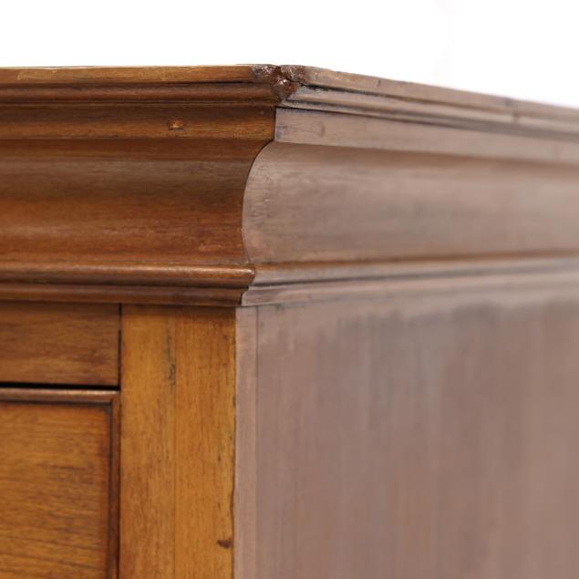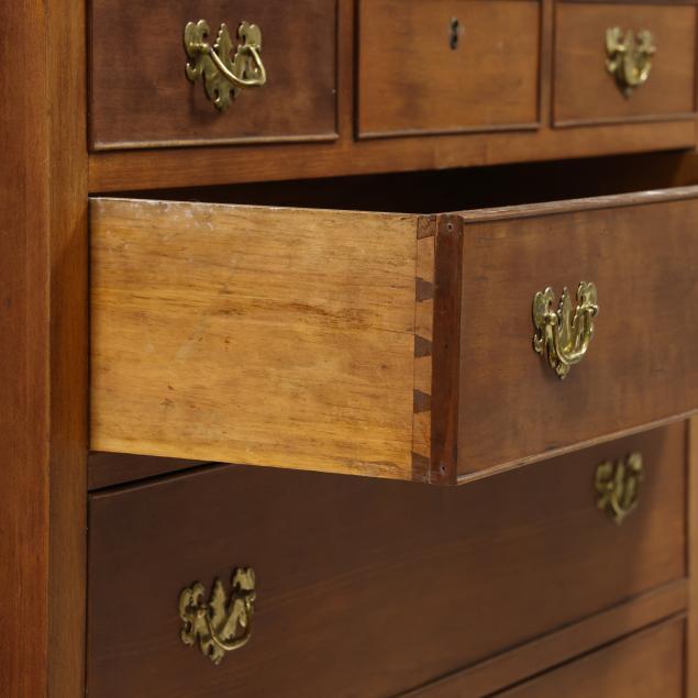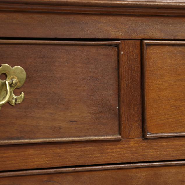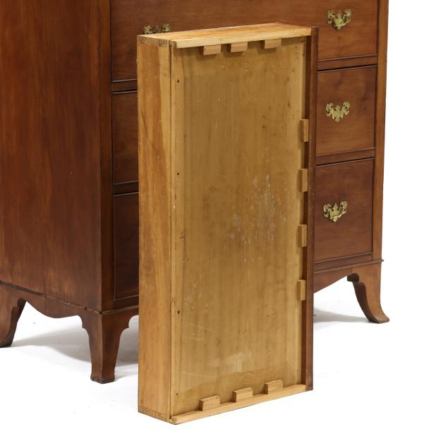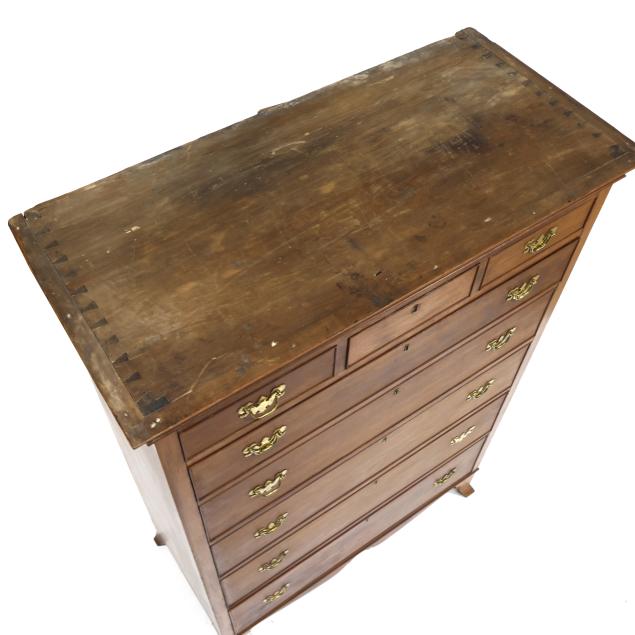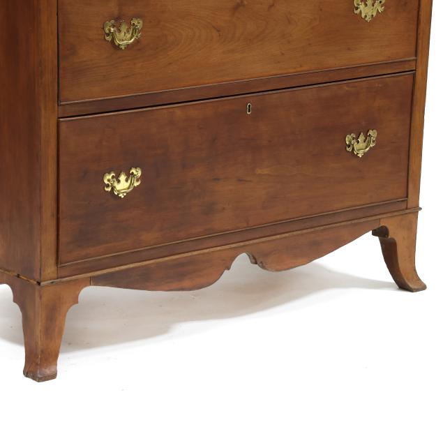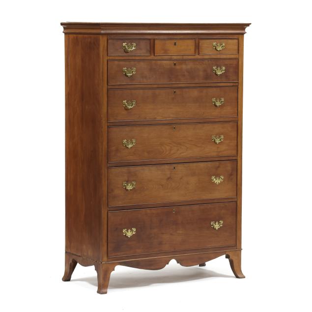 Attributed to Kentucky, late 18th century, poplar and white pine secondary, dovetailed case, applied molded cornice, three over five graduated cock beaded drawers, flush paneled sides, applied beaded trim at base, scalloped skirt, French bracket feet to the front and rear; original vertical back boards with beaded tongue and groove.