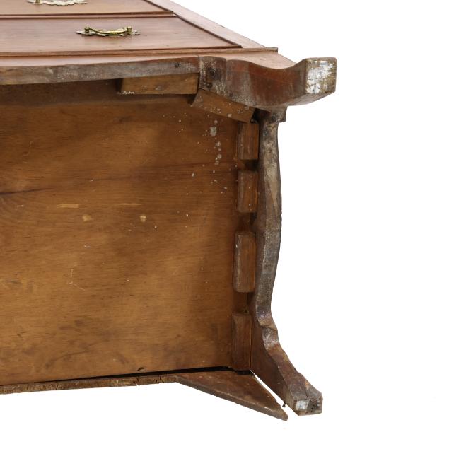 Break and repair to upper right rear edge of right side case; later pulls; original skirt and feet; one bail missing (but present); missing beaded edge at left side base.