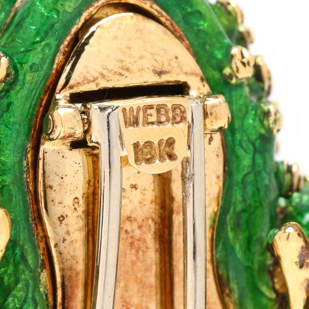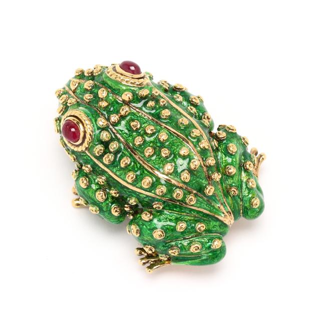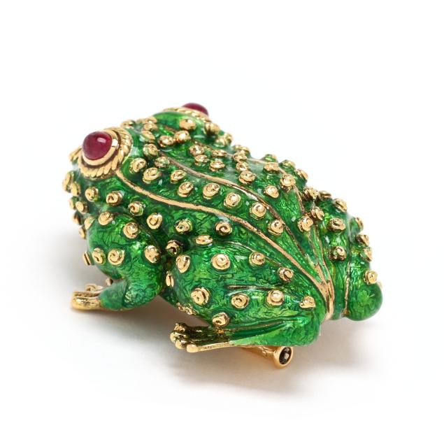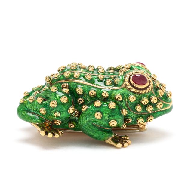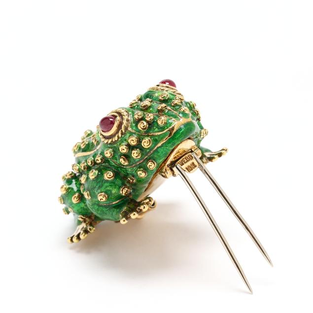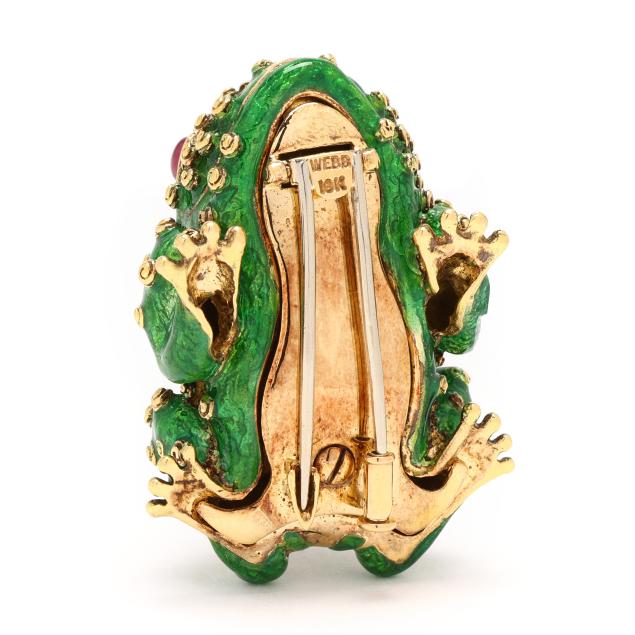 from the Kingdom Collection, the crouching frog with green guilloche enamel in a swirl motif to resemble amphibian skin, with allover raised gold elements, the eyes set with oval cabochon cut rubies within a rope twist border, completed with a double pin stem with trombone clasp, signed Webb and stamped 18K.