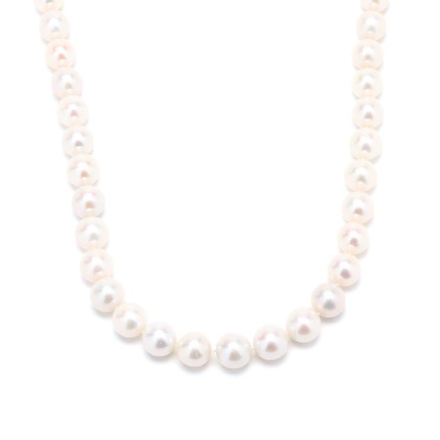 Pearls display a white bodycolor with orient, very good luster, heavily spotted surface, and acceptable nacre.
