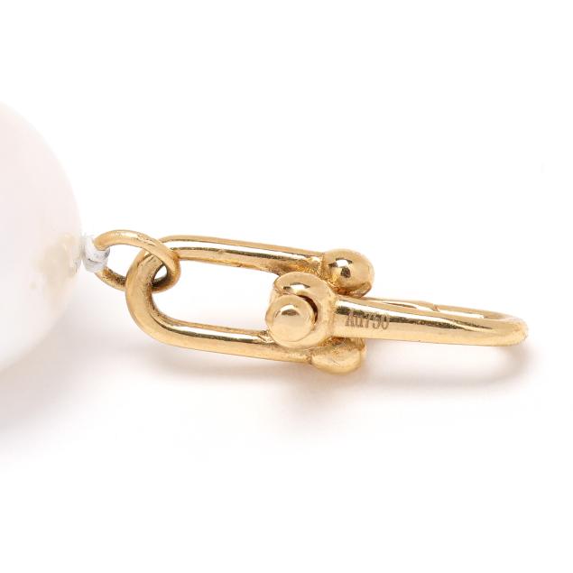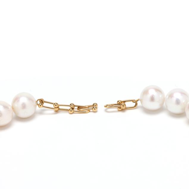 Strung knotted with (54) round cultured South Sea pearls (13.5mm to 14.0mm), completed with gold 'U' link chain and matching clasp, stamped Au750.
