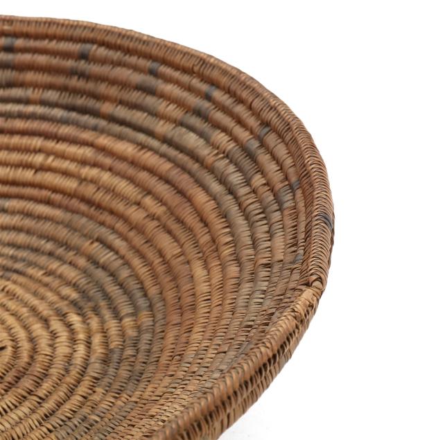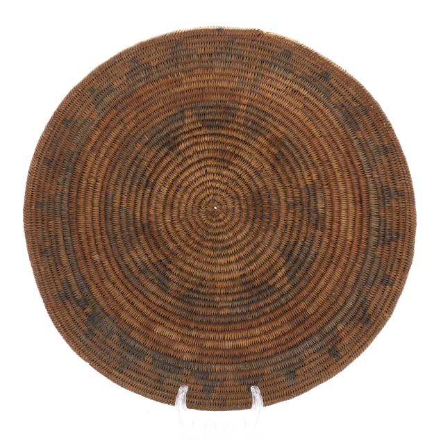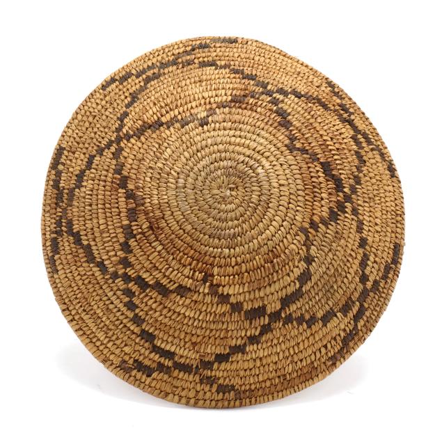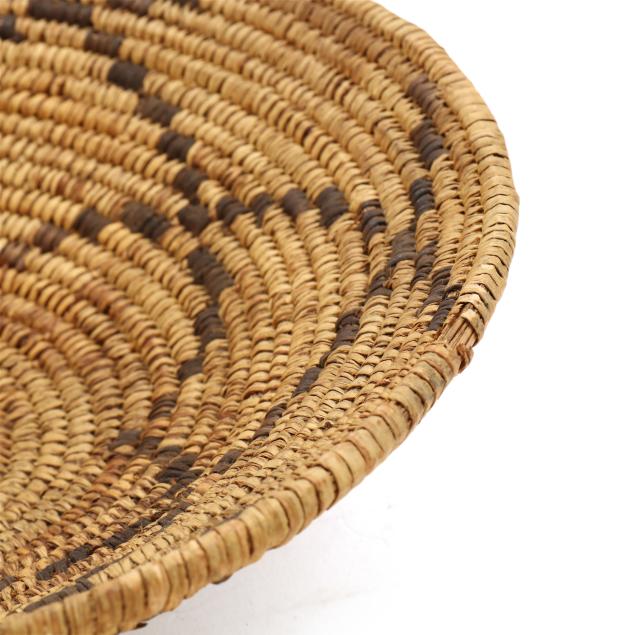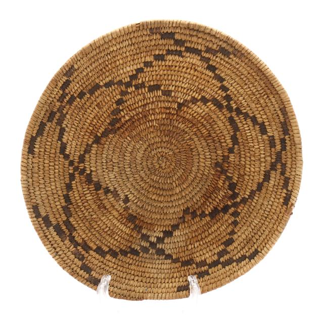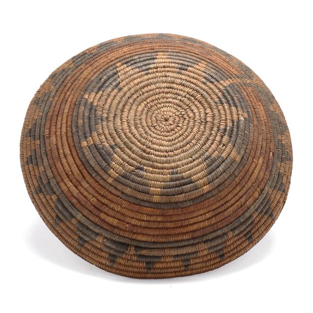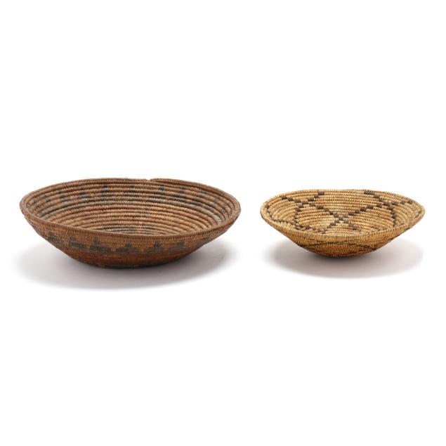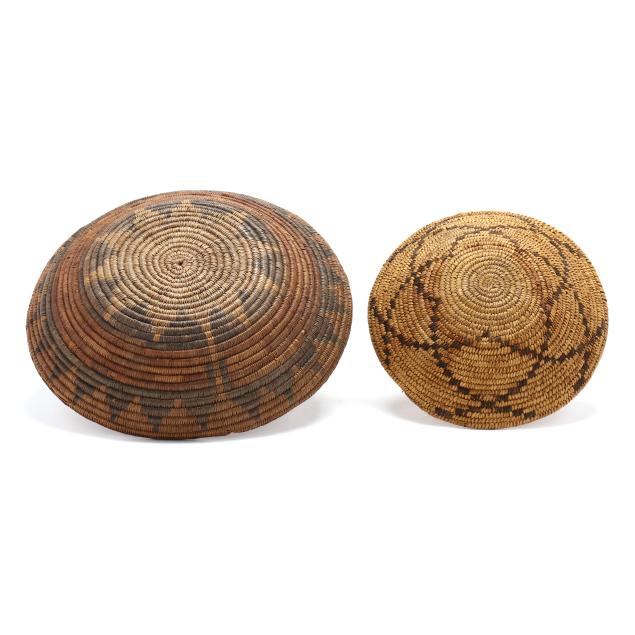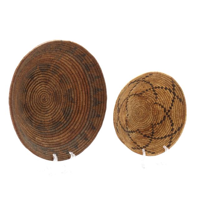 The first, an early-20th-century hand-woven Navajo wedding basket using dyed sumac and possibly willow and yucca stems with a braided rim (15 in. diameter); and the second, a mid-20th-century likely Papago hand-woven basket using beargrass and devil's claw with a geometric five-pointed star decoration and a straight woven rim (11 1/4 in. diameter).