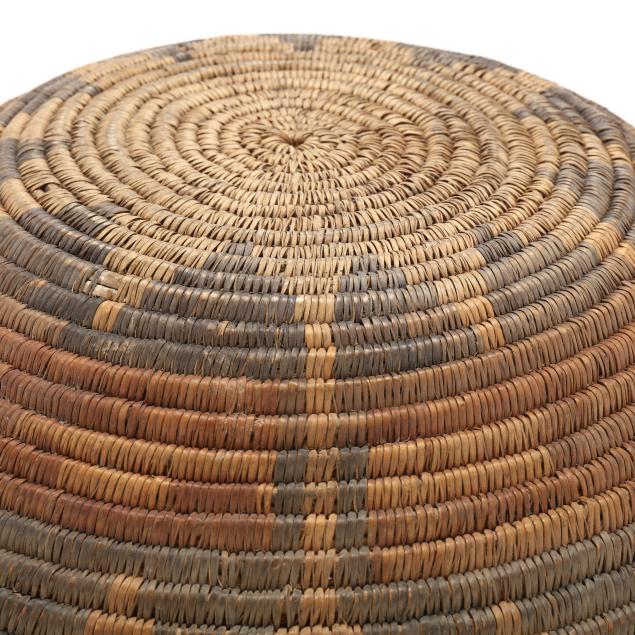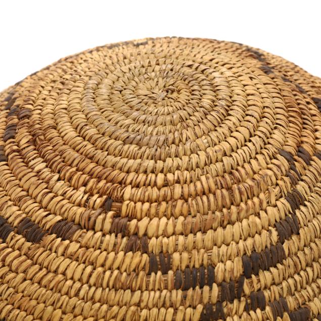 The Navajo basket with fading to dyes and a few small weave losses; a few areas of fraying to Papago basket.