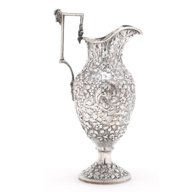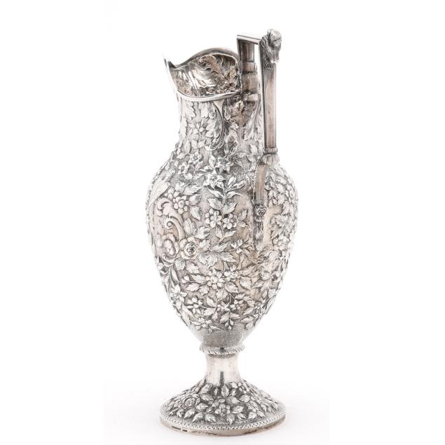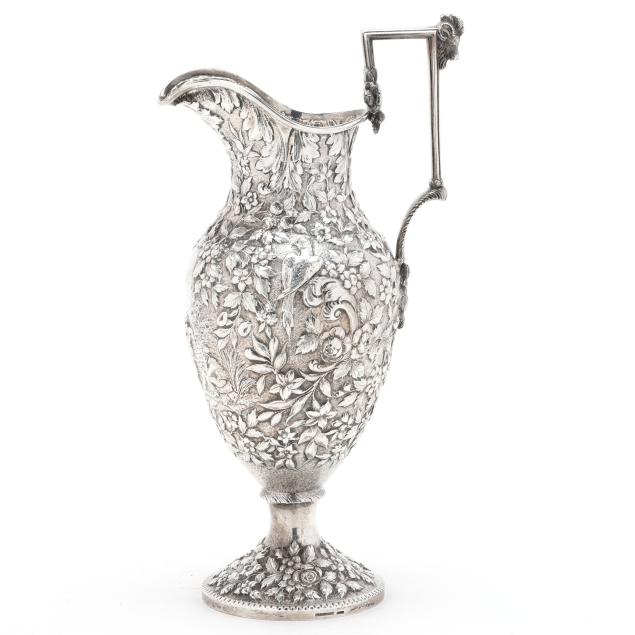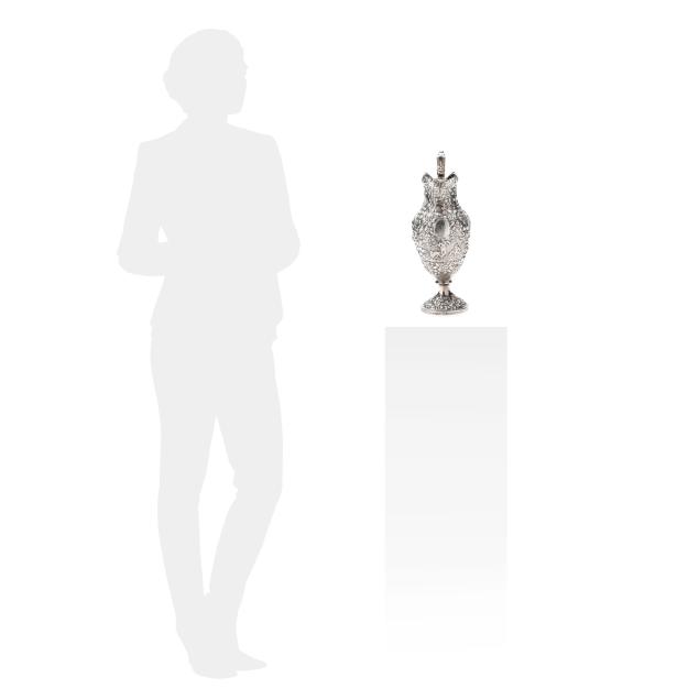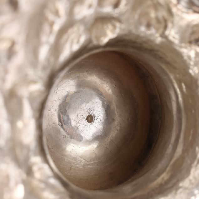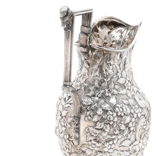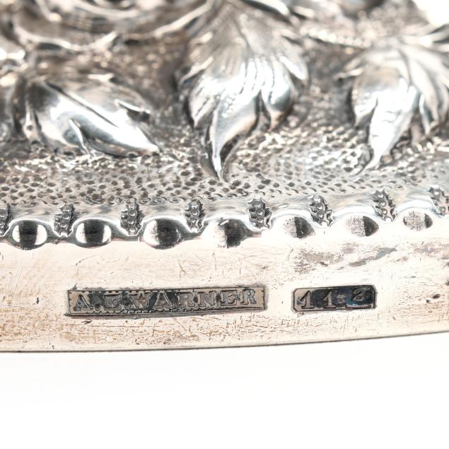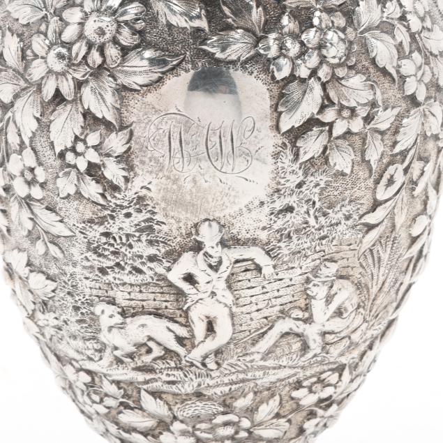 Circa 1860s, marked "A.E. Warner" and "11.2" indicating the silver content, featuring a central hunt themed landscape flanked by pheasants against a hand chased floral ground, with a rams head handle, not monogrammed.