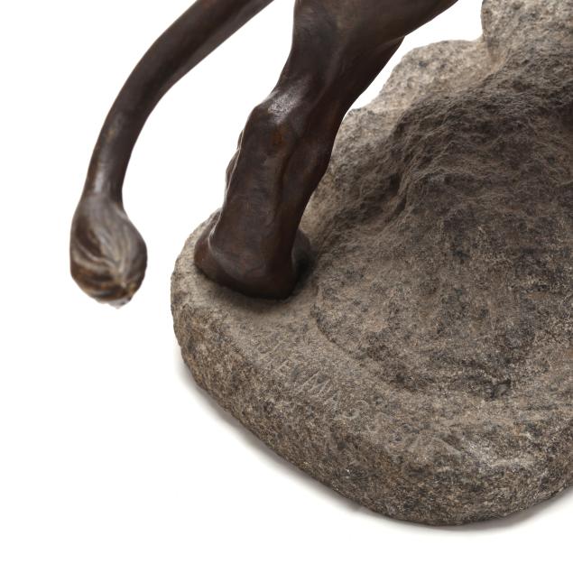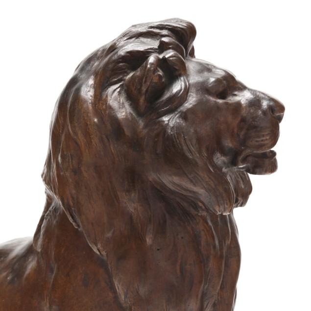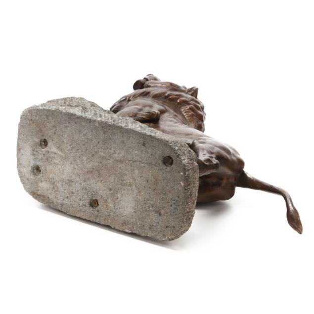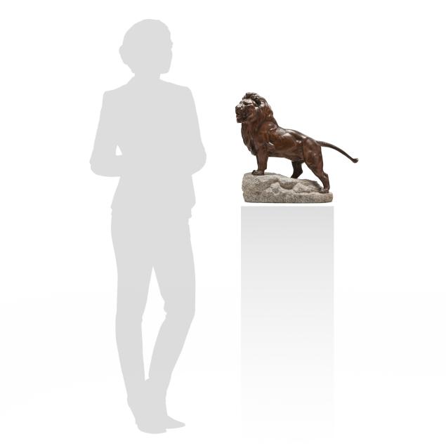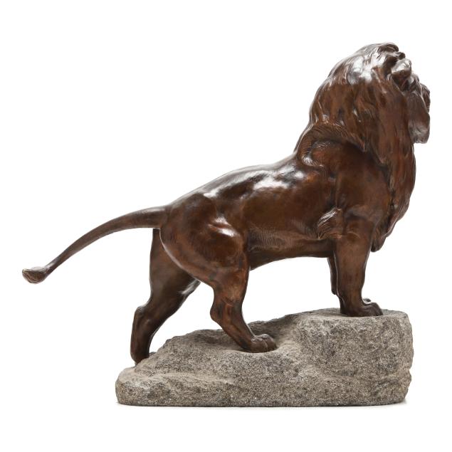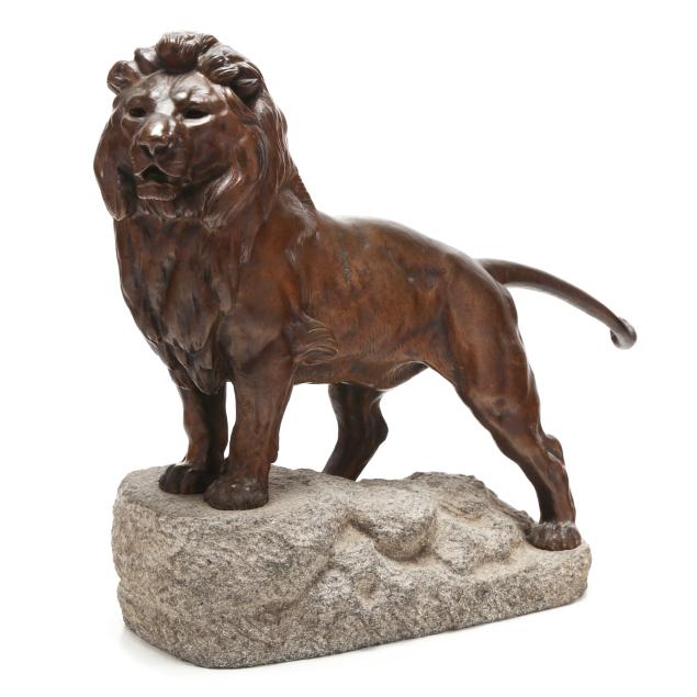 Patinated bronze model of a stately lion, mounted atop a carved granite precipice with "J. E. MASSON" carved signature.