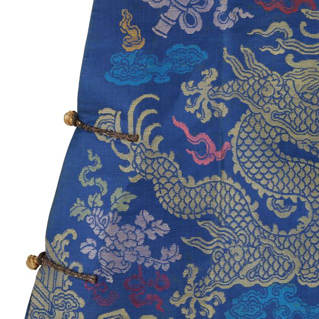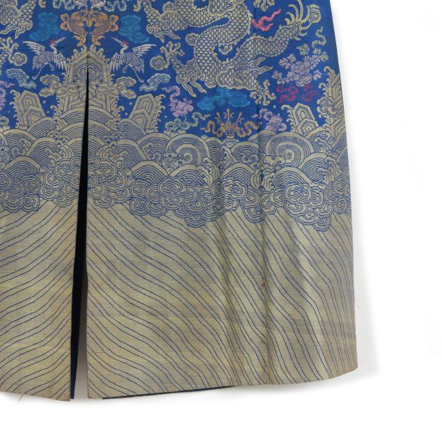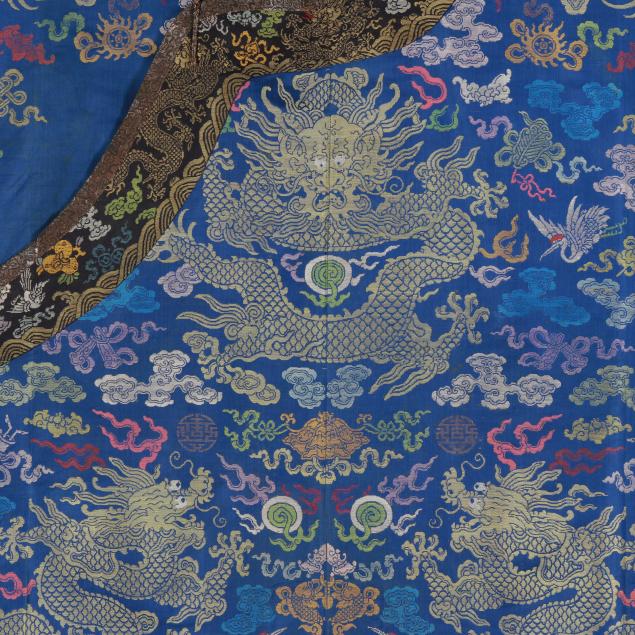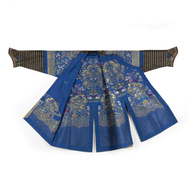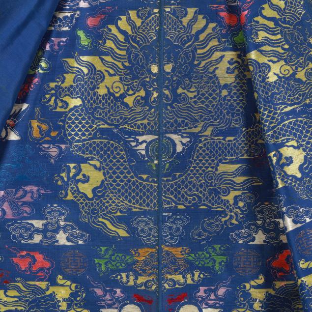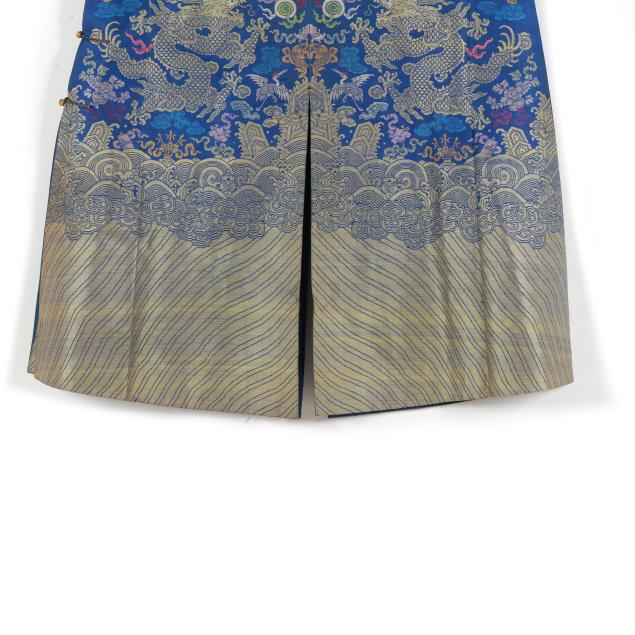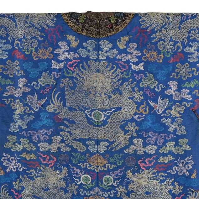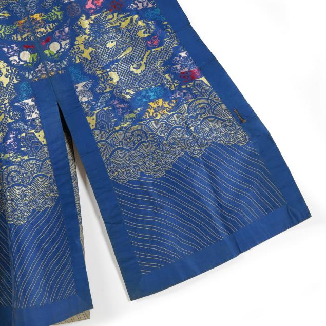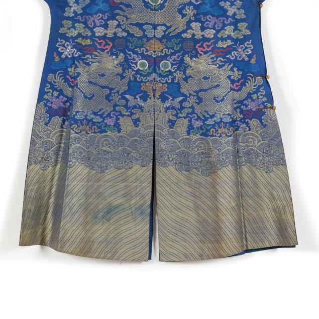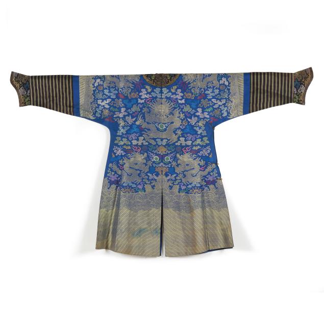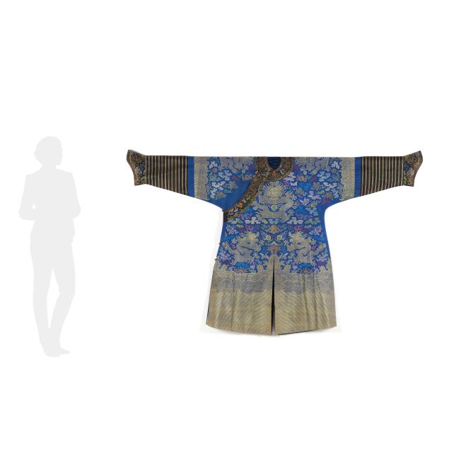 Robes bearing frontal five-clawed dragons were only worn during the Qing dynasty by the imperial family, and the blue color primarily for the princes. Robes like this one were worn during the summer months due to the heat and humidity. They were embroidered with the same decoration and motifs as the silk satin robes worn during the colder seasons, but in a lighter fabric.