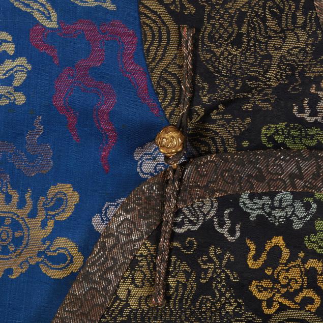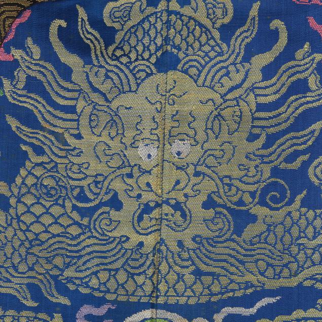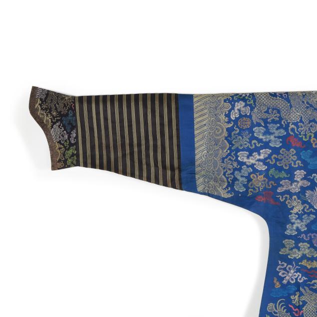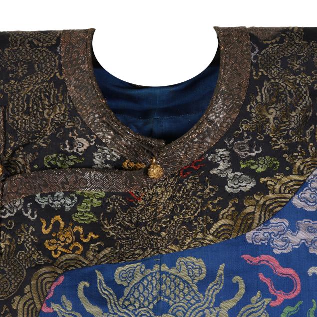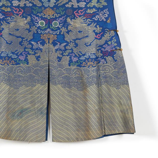 lishui stripe surmounted with three mountain peaks representing the universe, the collar and horseshoe cuffs are embellished with dragons, five gold buttons line the collar and left edge of robe, unlined except at sleeves.