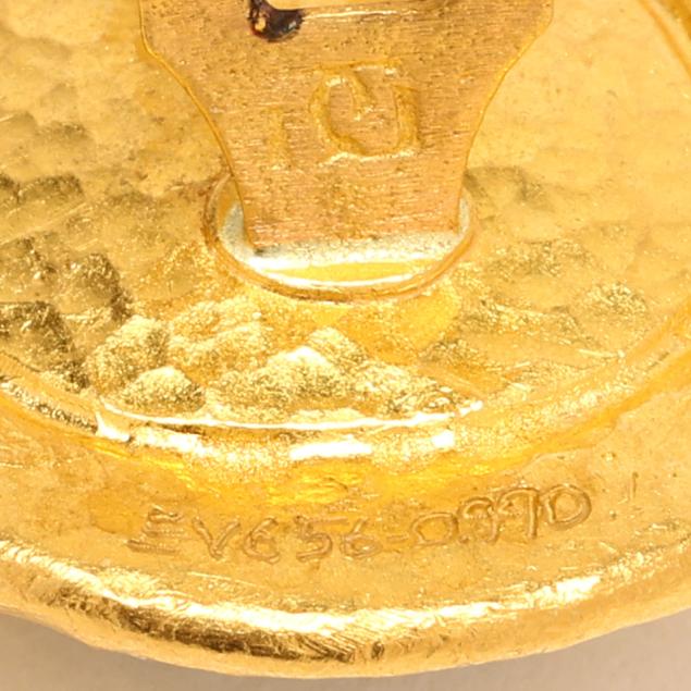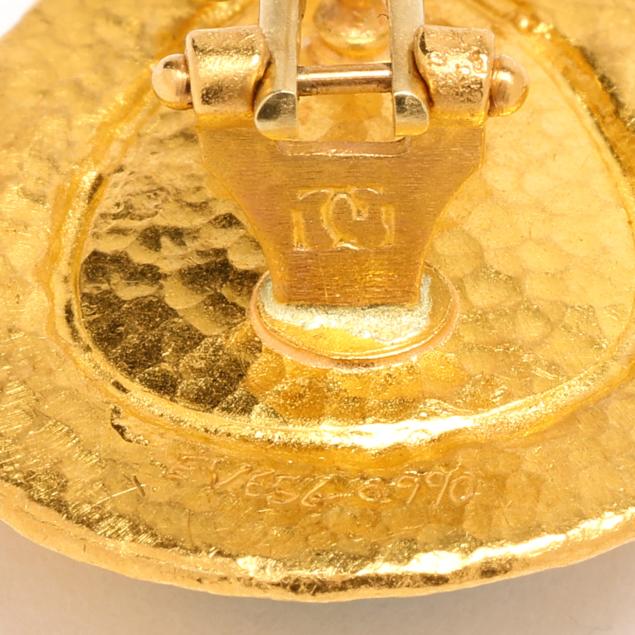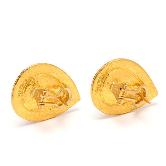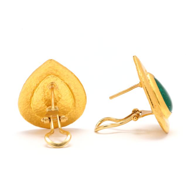 Hand-hammered teardrop design earrings set to the center with a pear cabochon cut emerald, completed with posts and omega clip backs, stamped with maker's mark and marked EV656 0.990, XRF testing 23KT.