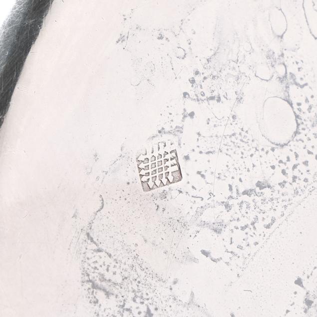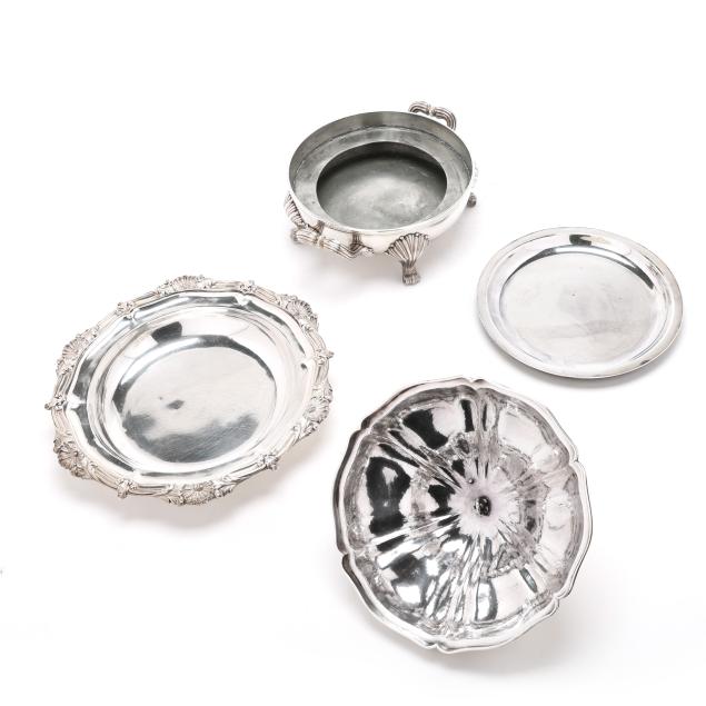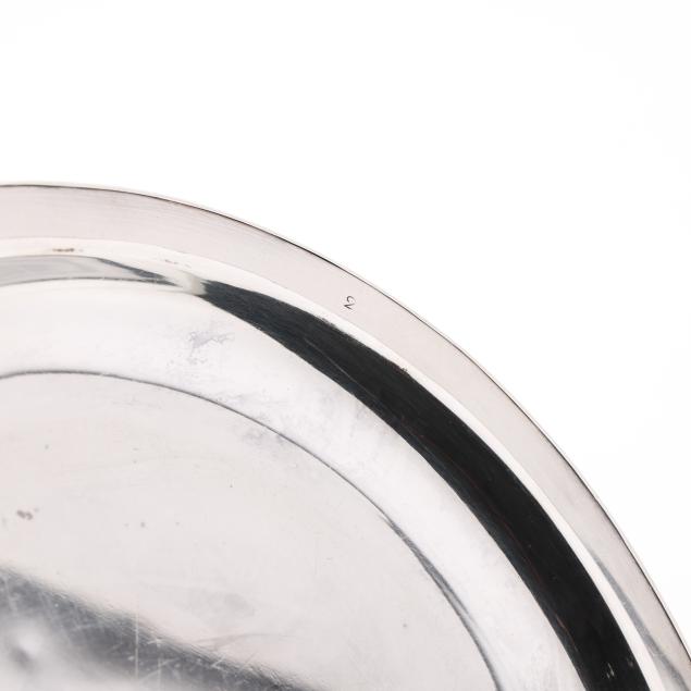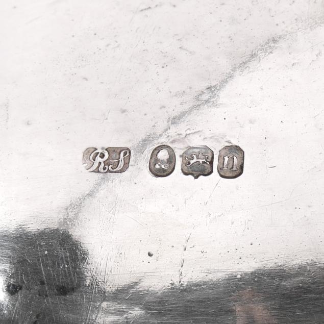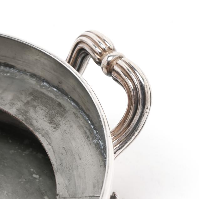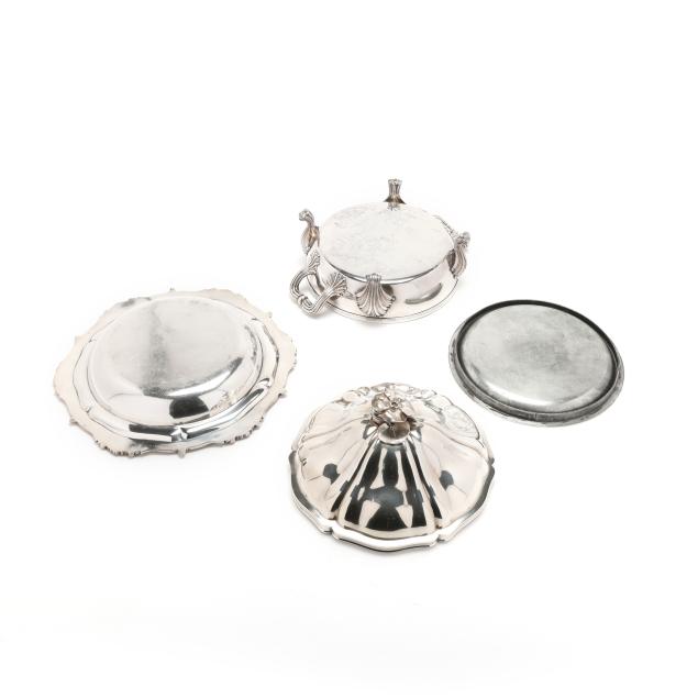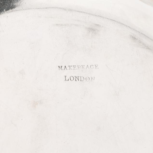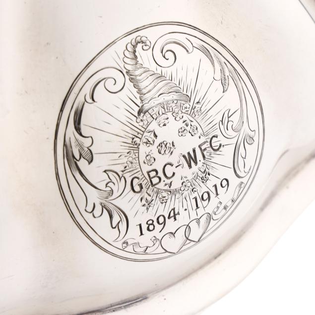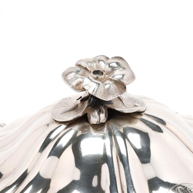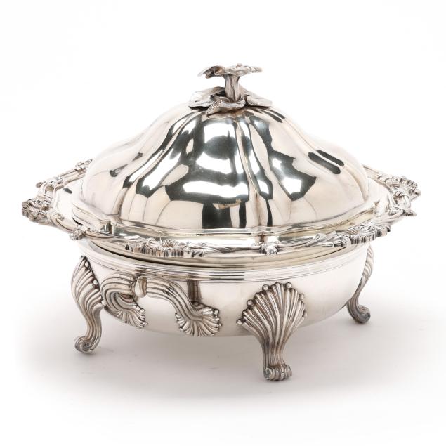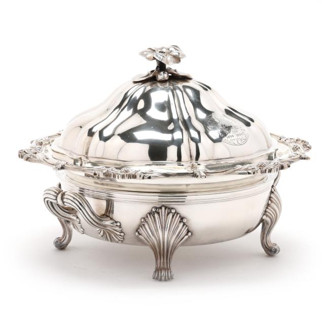 The lid with Georgian silver hallmarks, featuring a foliate finial and engraved "CBC-WFC: 1894-1919" to a cartouche; over a silver-plated dish with rocaille rim marked "Makepeace London"; over a silver plated warming stand with fluted feet and handles, mark of T & J Creswick.
