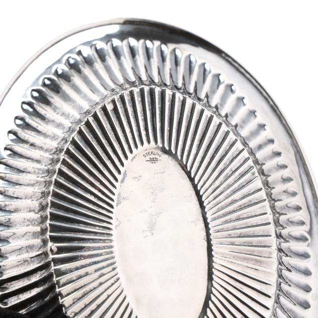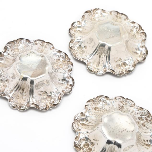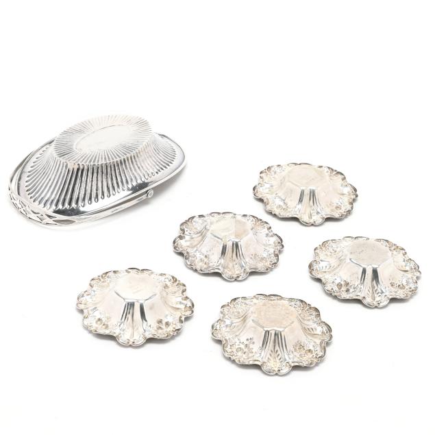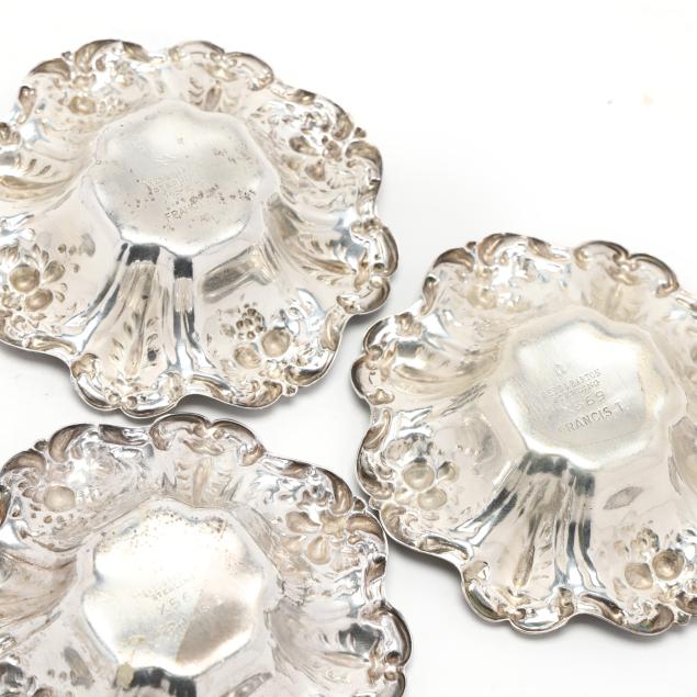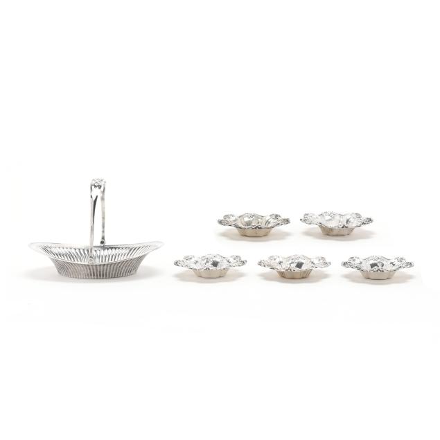 The nut dishes, date mark of 1905, pattern number X569, not monogrammed (3 1/4 in. dia.); and a Webster sterling silver basket with swing handle (1 3/8 x 6 1/4 x 4 1/2 in.); not monogrammed.