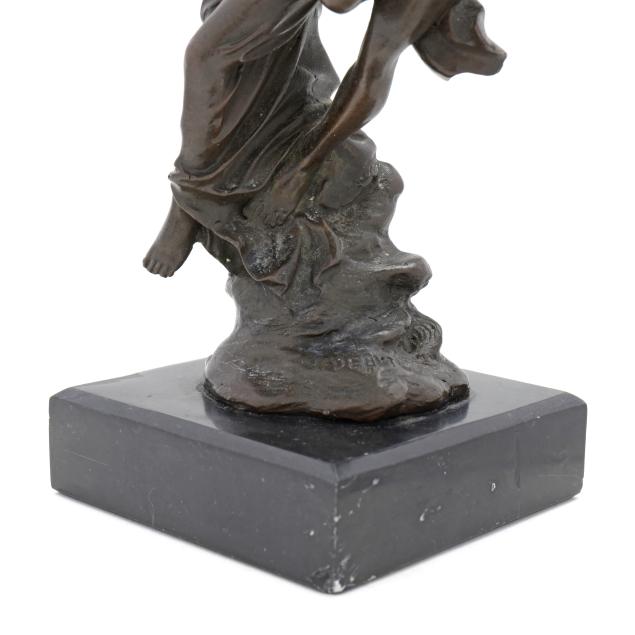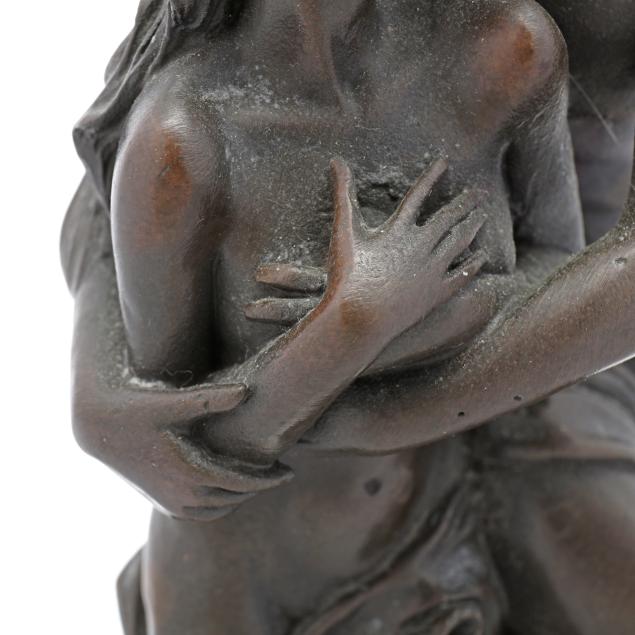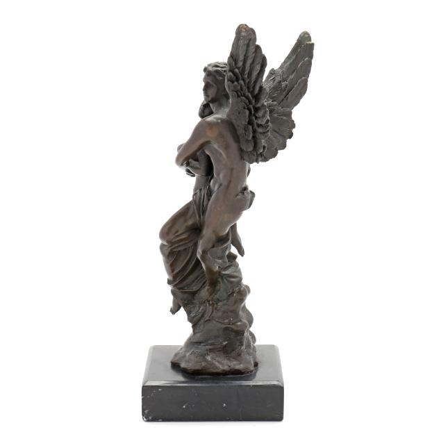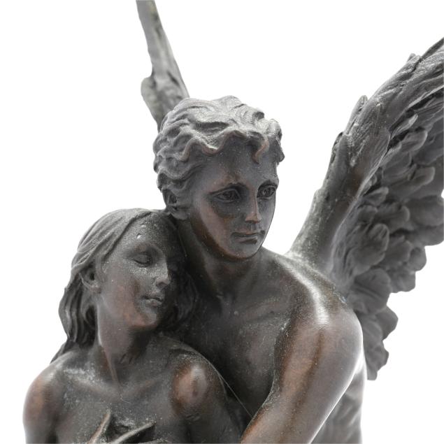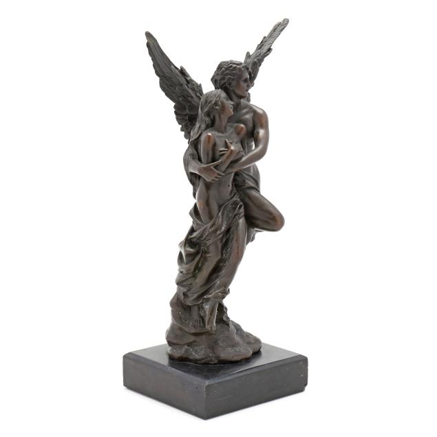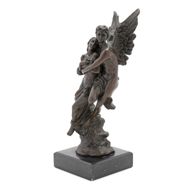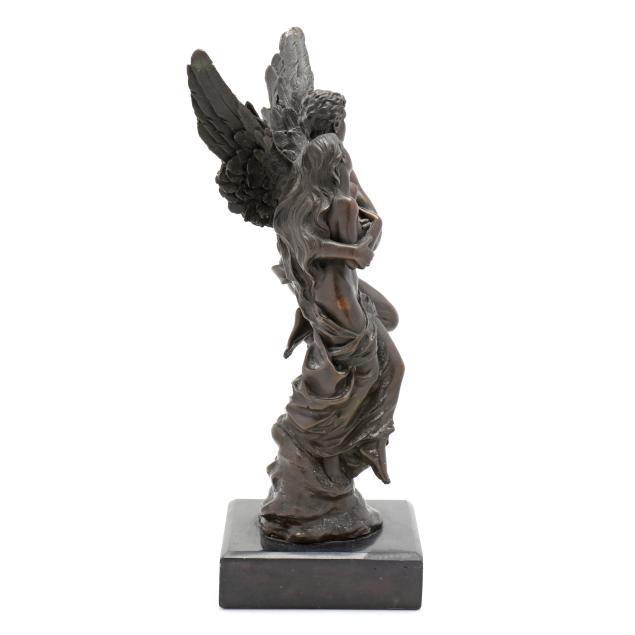 Patinated bronze, inscribed "DEBUT" to base, depicting Cupid carrying Psyche atop a stylized cloud form base, mounted to a square slate plinth.