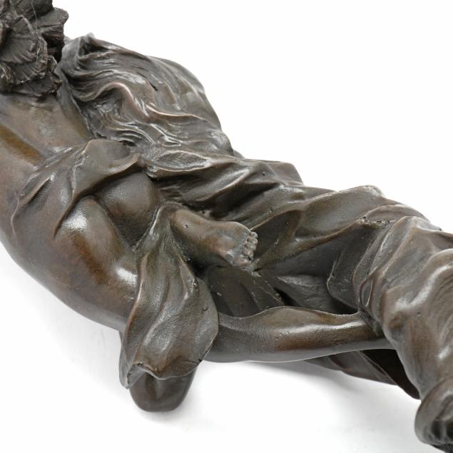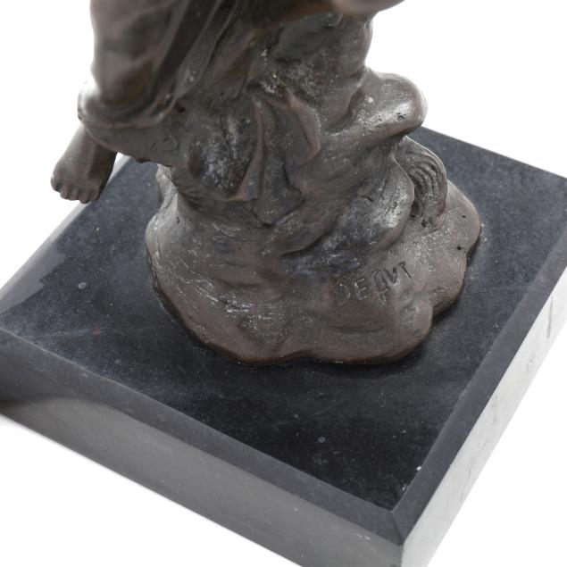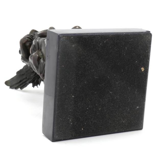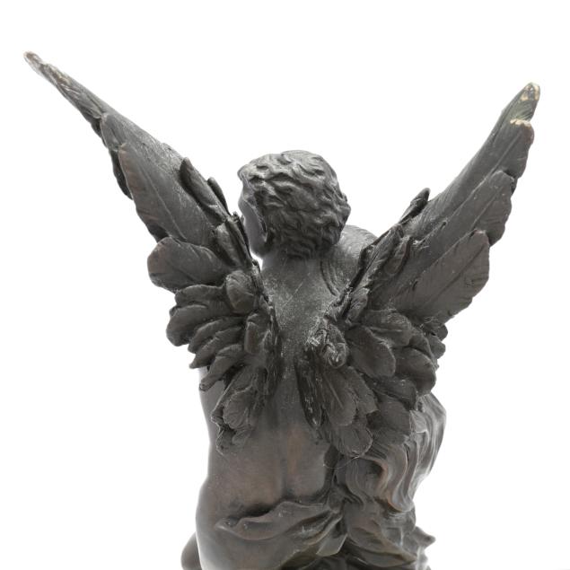 Nicks to bronze at tips of Cupid's wings; some verdigris and oxidation spotting to crevices; nicks and small chips to slate plinth, mainly at front right corner; restoration to left corner of plinth.