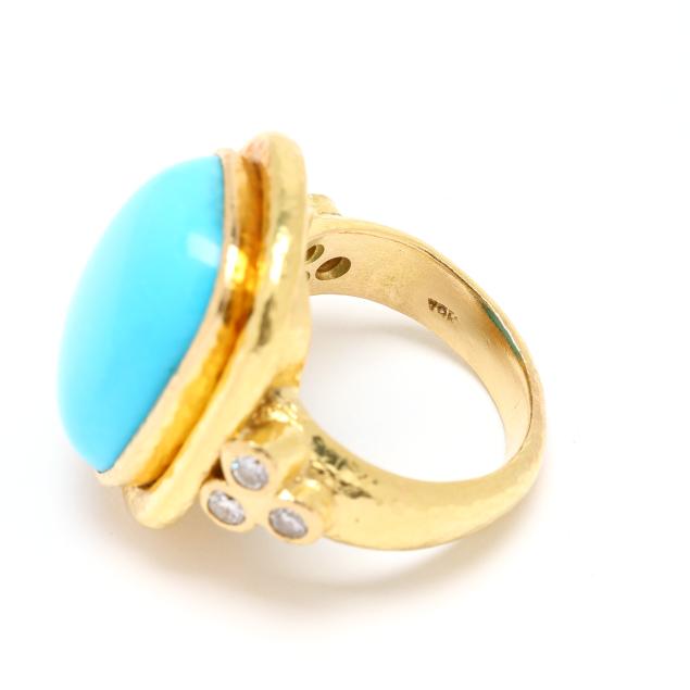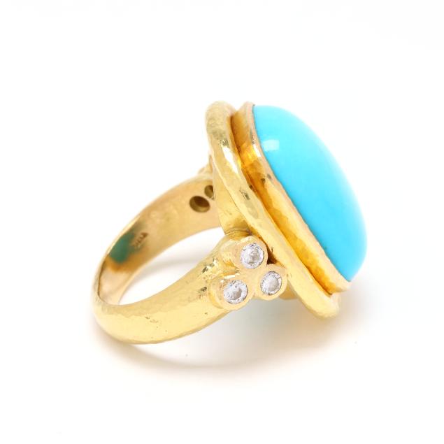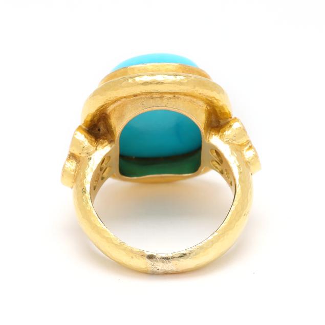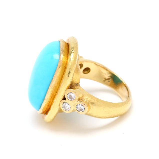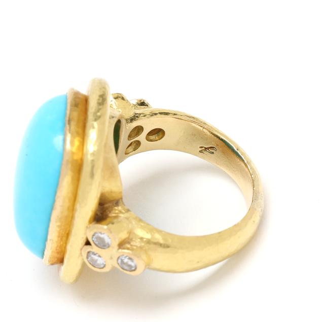 Centered on an elongated cushion cabochon cut turquoise (17.7 x 12.7mm), bezel set in a hand-hammered gold surround, the shoulders with collet set full cut round diamonds weighing approximately .24 total carat (F-G color, VS1-VS2 clarity), stamped with partial purity mark and with maker's mark, XRF testing 20KT.
