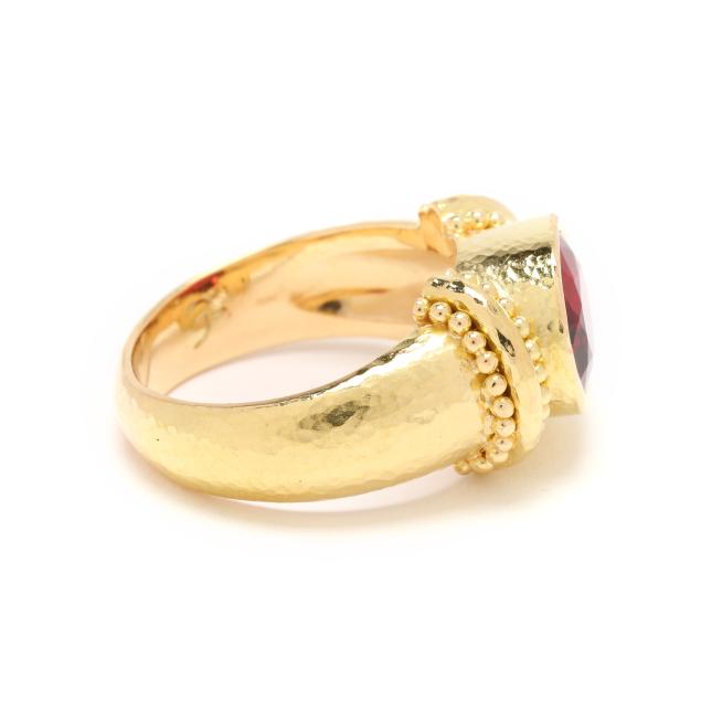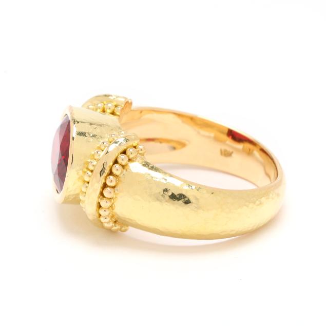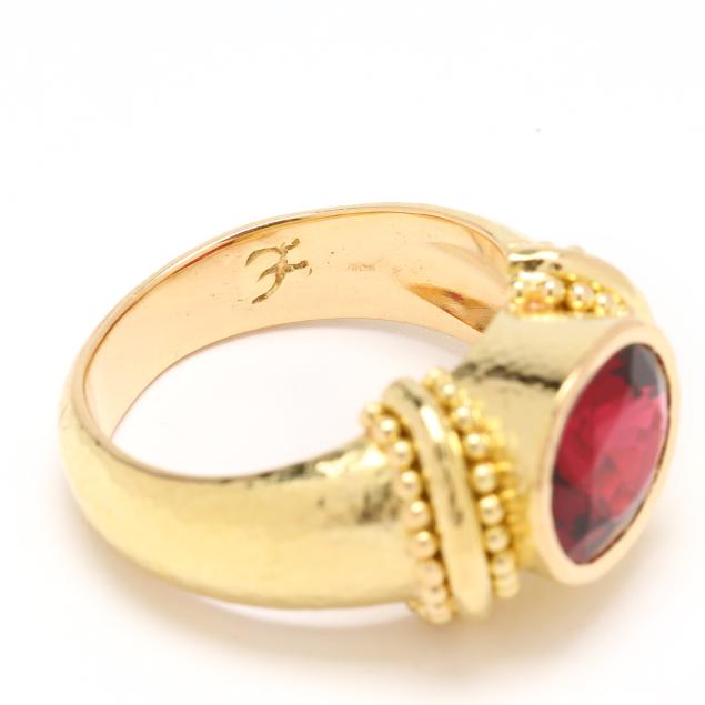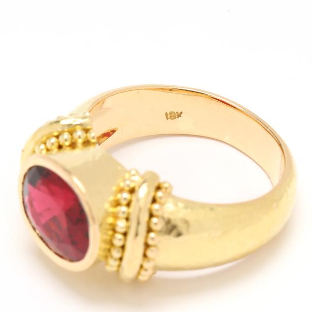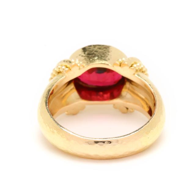 Bezel set to the center with an oval cut red spinel (9.4 x 7.5 x 4.84mm) weighing approximately 2.40 carats, the shoulders with beaded detailing, on hand-hammered tapering shank, stamped 18K and with maker's mark, XRF testing 19KT.
