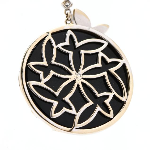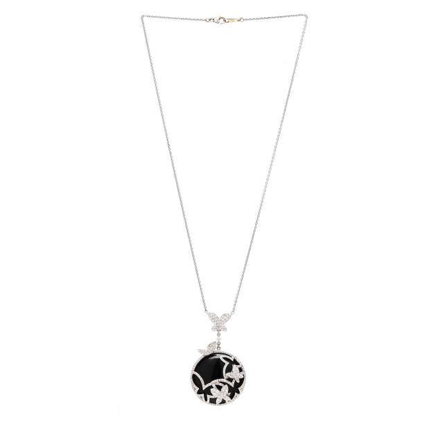 The cable link chain necklace completed with a lobster clasp, stamped 18K / JMP, with butterfly pendant pavé set with full cut round diamonds, suspending a round cabochon cut black onyx set within a surround of full cut round diamonds, and with white gold butterfly motif overlay pavé set with full cut round diamonds, stamped 18K / JMP. The total diamond weight is approximately 1.75 carats (H-I color, SI1-SI2 clarity).