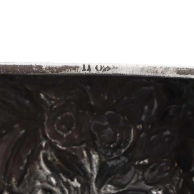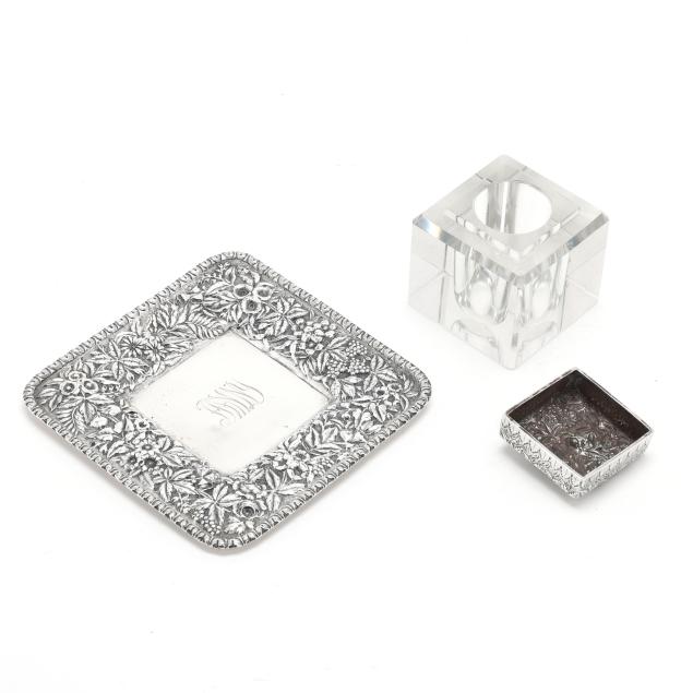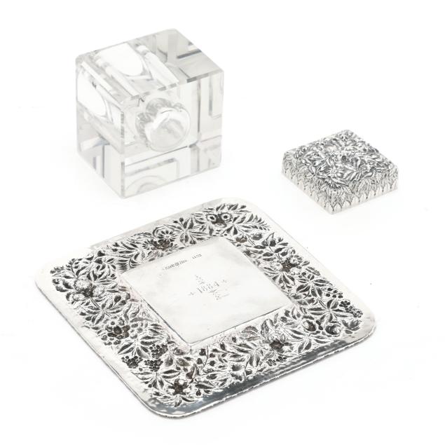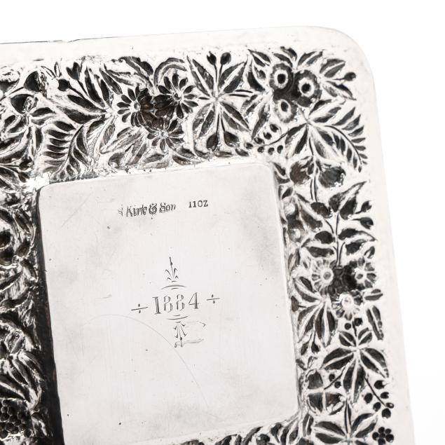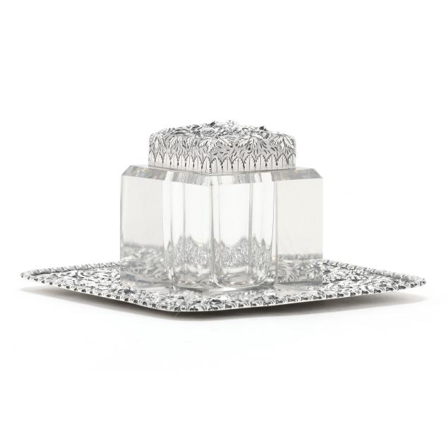 Date marks circa mid- to late 19th century, featuring hand chased foliate motifs on a stippled ground, includes a beveled crystal inkwell with lid and under plate, the under plate inscribed "Fanny" and engraved "1884" to the underside.