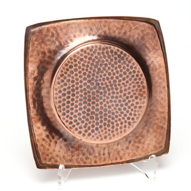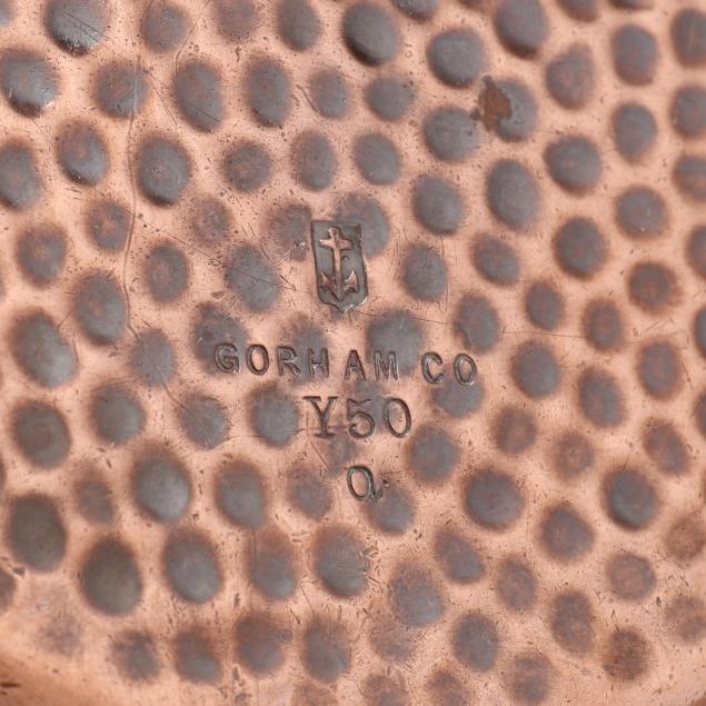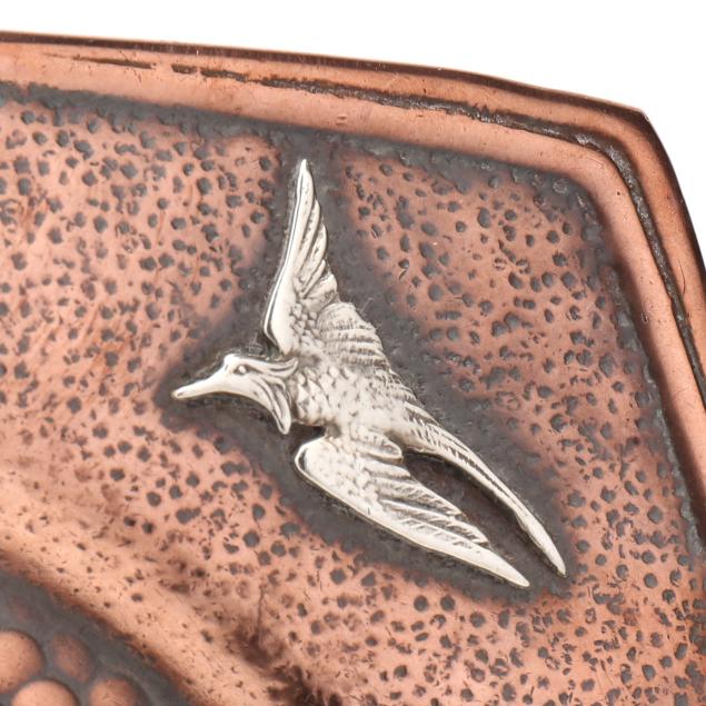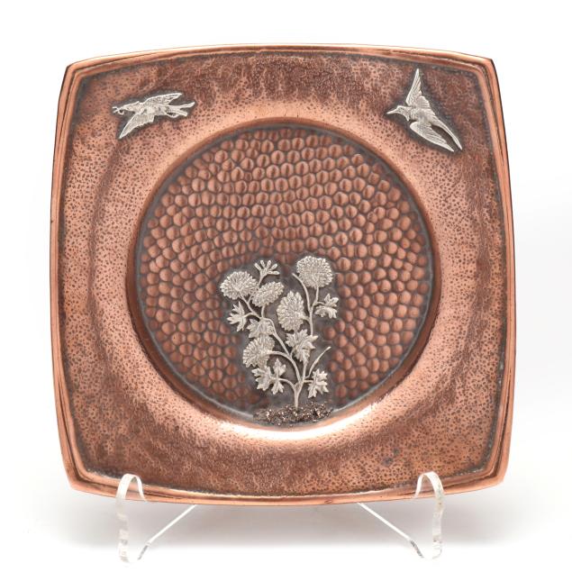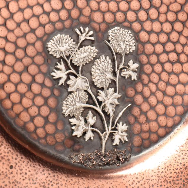 Circa 1880s, pattern number Y50, hammered copper with stippled rim and fish scale well, with foliate and soaring crane silver mounts in the Japanese taste, not monogrammed.