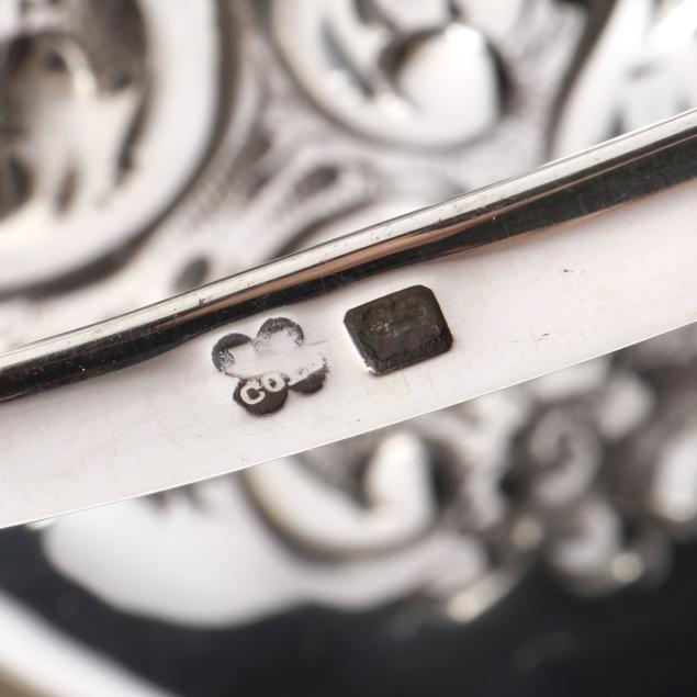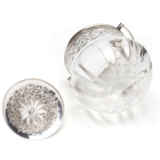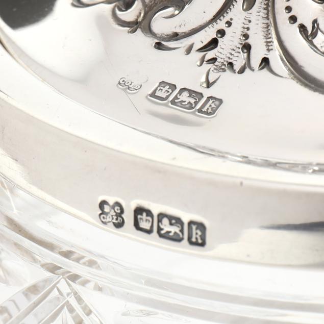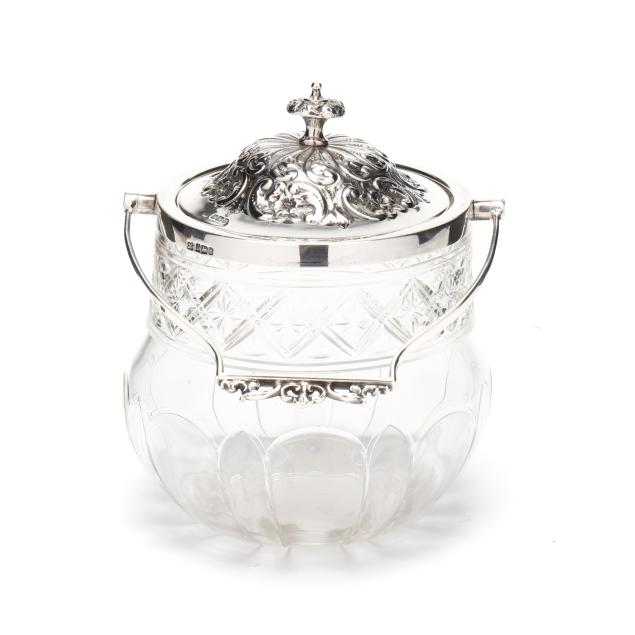 Sheffield (1902), with scrolled repousse decoration to the lid and a swing handle, mounted to a lobed glass jar, not monogrammed.