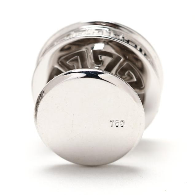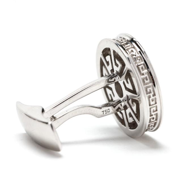 To include: a pair of circular cufflinks, with mother-of-pearl to center within a surround set with full cut round diamonds, and with Greek key details to edge and backing, completed with a hinged whale tail back, stamped 750 (5/8 in.); with a set of four buttons en suite, stamped 750 (.5 in.). The total diamond weight is approximately .94 carat (G-H color, VS1-VS2 clarity).
