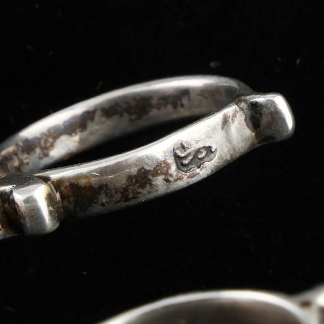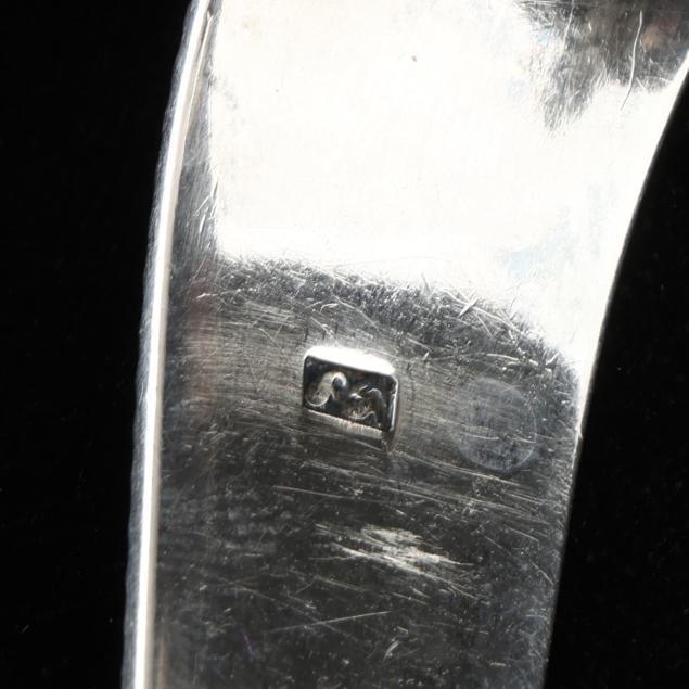 The first, a pair of George III silver asparagus tongs, mark of George Smith (III), London, with an armorial monogram (11 1/2 in.); a pair of Georgian silver sugar tongs, not marked, with shell form bowls, not monogrammed; and a French silver pastry fork with faux handle, 2nd standard silver, not monogrammed (5 1/2 in.).
