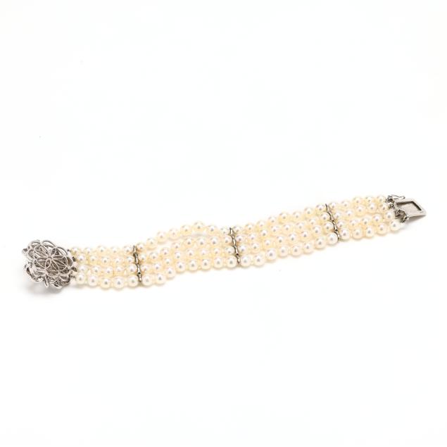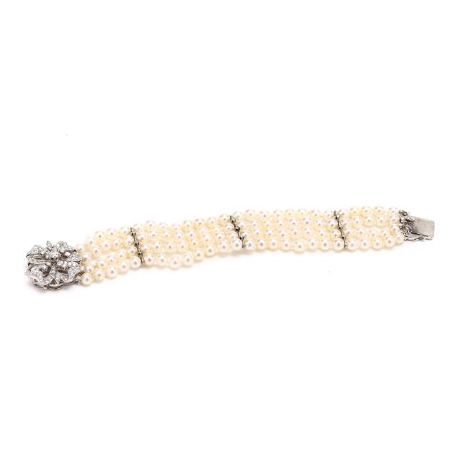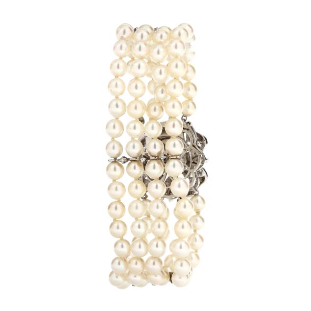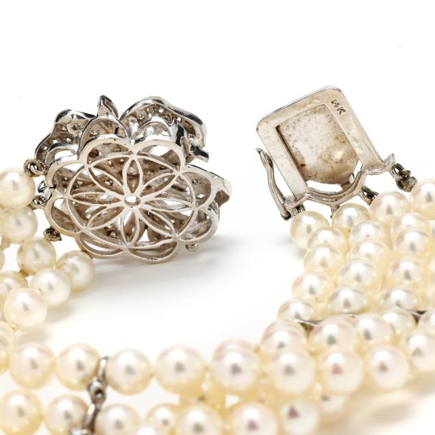 Strung knotted with four strands of round cultured pearls (5.50mm to 6.0mm) and with three white gold stations set with single cut diamonds, completed with a white gold box clasp in a floral motif set with full cut round and single cut diamonds and with a figure eight safety, stamped 14K. The total diamond weight is approximately 2.00 carats (G-H color, SI1-SI2 clarity).